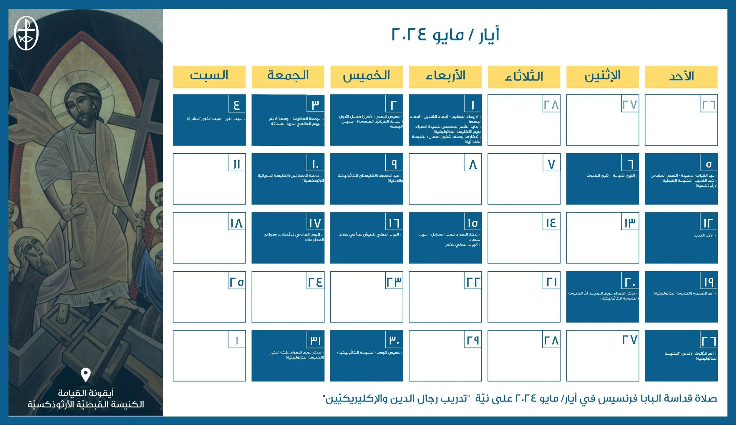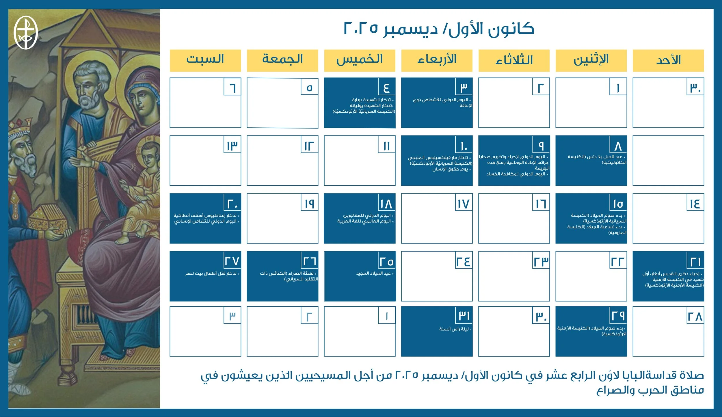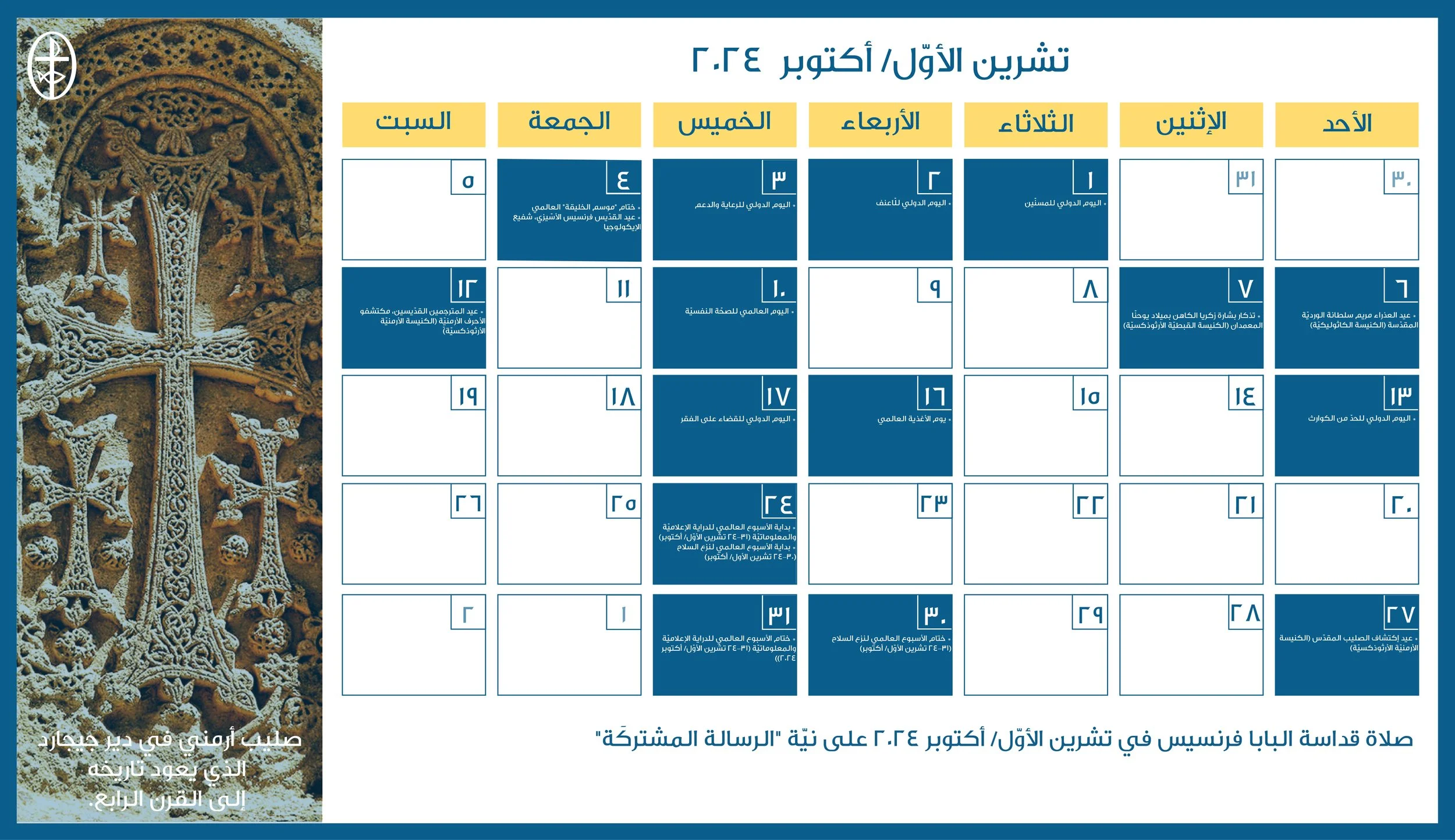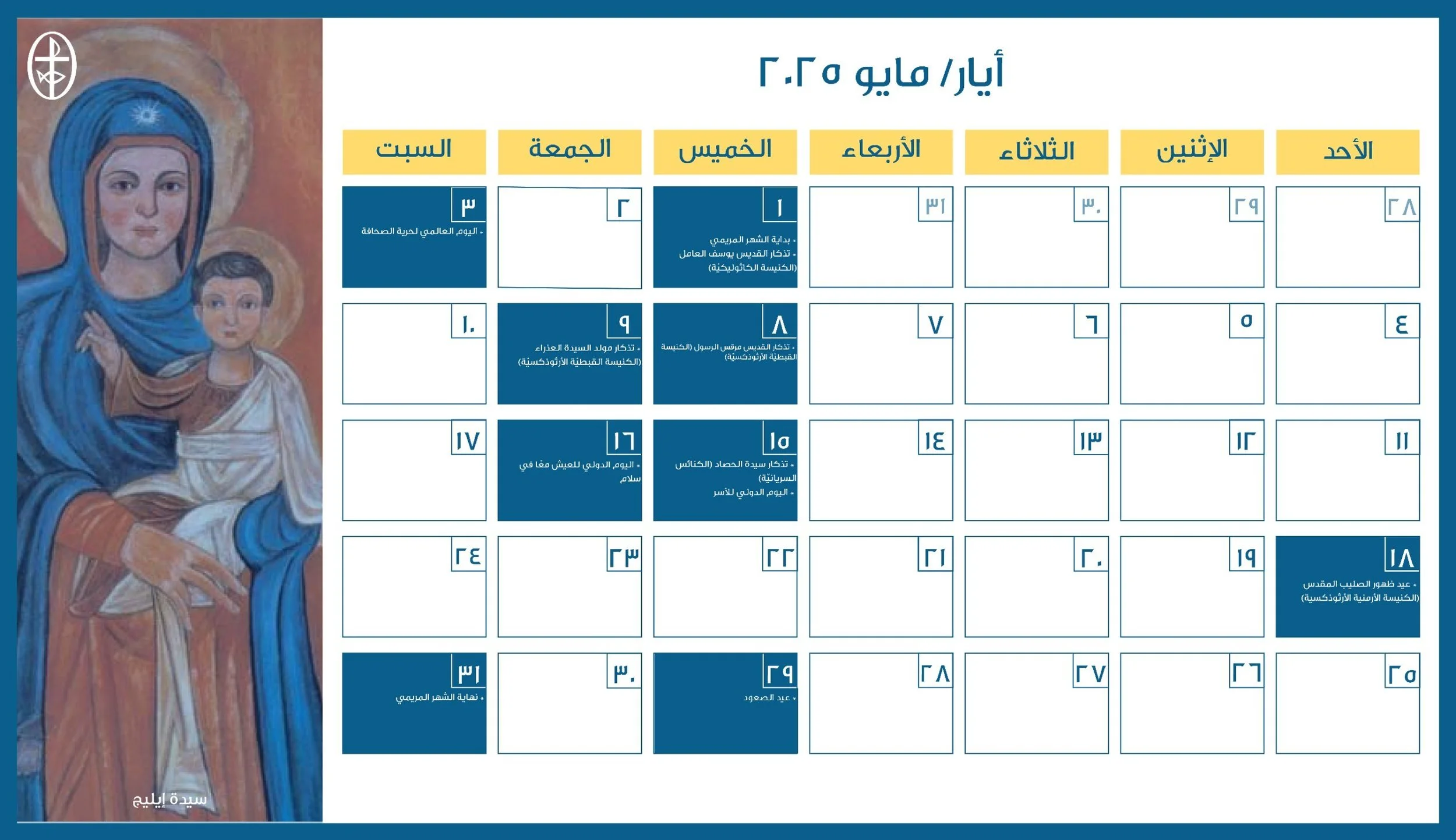 أعدّ مجلس كنائس الشرق الأوسط، دائرة التواصل والعلاقات العامة، رزنامة مسكونيّة إلكترونيّة، تضمّ الأعياد الكنسيّة واللّيتورجيّة الخاصّة بمختلف العائلات الكنسيّة في الشرق الأوسط إضافةً إلى الأيّام الدوليّة المحدّدة من قبل الأمم المتّحدة والّتي تتوافق مع هويّة المجلس ورسالته الرّوحيّة والإنسانيّة.