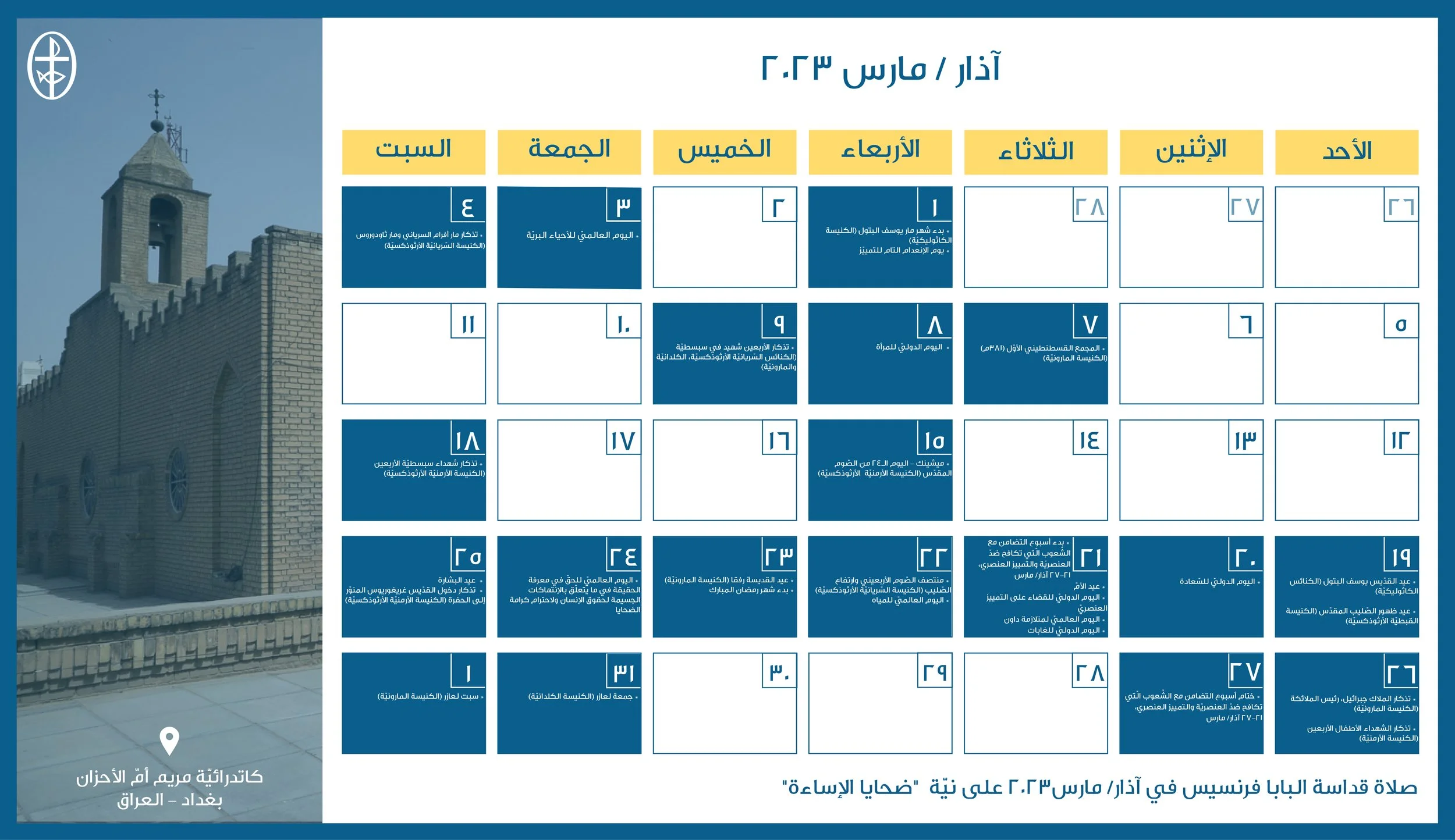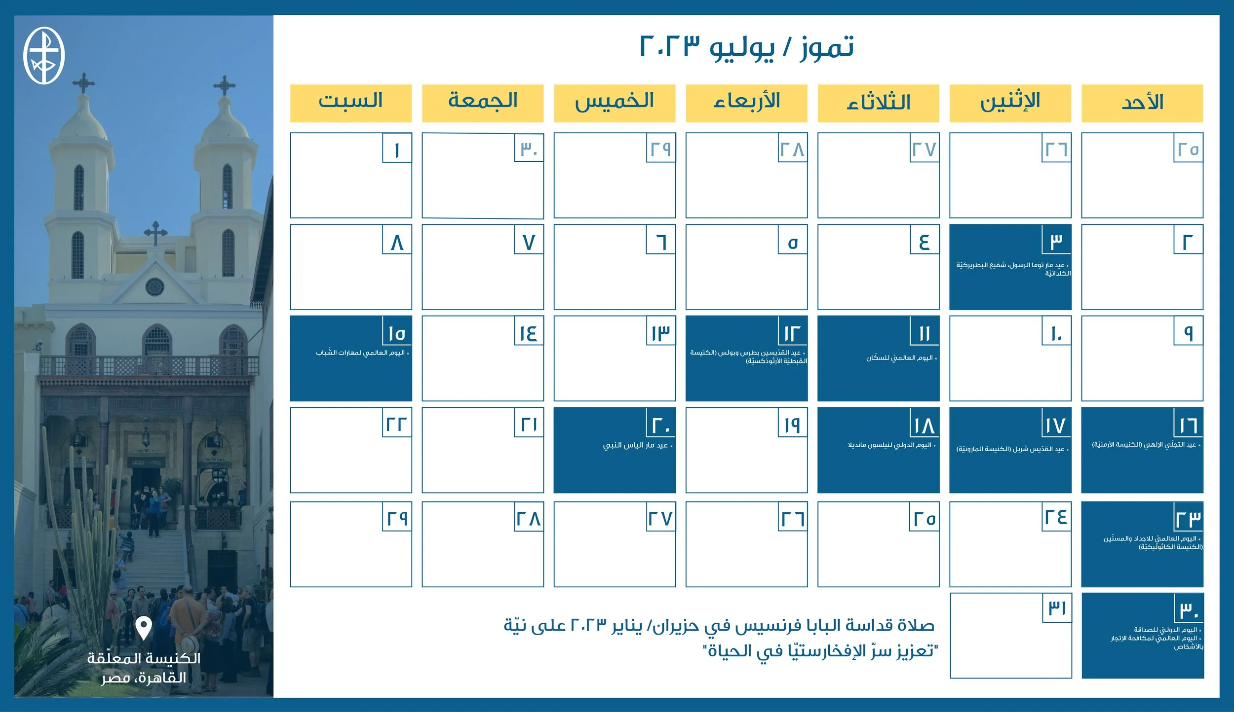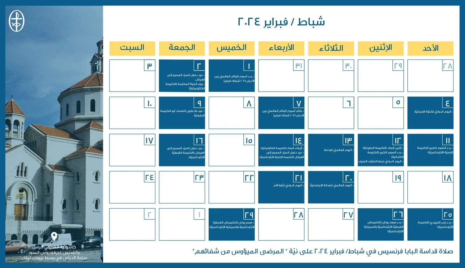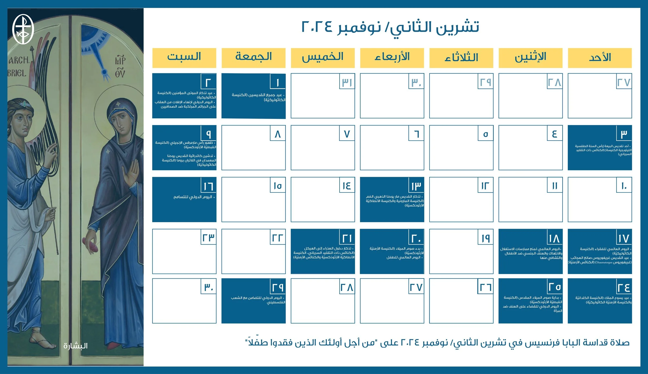 أعدّ مجلس كنائس الشرق الأوسط، دائرة التواصل والعلاقات العامة، رزنامة مسكونيّة إلكترونيّة، تضمّ الأعياد الكنسيّة واللّيتورجيّة الخاصّة بمختلف العائلات الكنسيّة في الشرق الأوسط إضافةً إلى الأيّام الدوليّة المحدّدة من قبل الأمم المتّحدة والّتي تتوافق مع هويّة المجلس ورسالته الرّوحيّة والإنسانيّة.