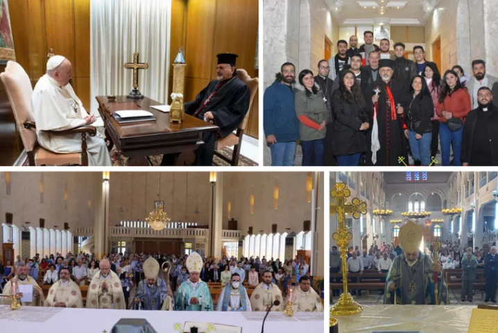 Clockwise L-R: Syriac Catholic Patriarch of Antioch and all the East Ignace Joseph III Younan meets with Pope Francis January 12, Meeting with youth group representatives at the parish of Saint Peter and Paul in Qamishli, Syria December 16, 2021, Celebrating Mass at the Church of Our Lady in Homs, Syria May 15, 2021. Syriac Catholic Patriarch of Antioch Ignace Joseph III Younan (center) celebrates Mass at the Cathedral of Our Lady of Assumption in Aleppo, Syria May 16, 2021. (photo: Courtesy photos / Syriac Catholic patriarchate)
