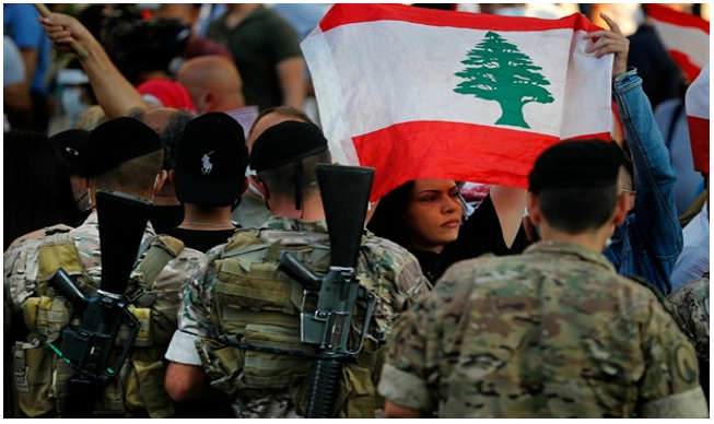 An anti-government protester holds a national flag in front of Lebanese army soldiers during a protest in Zalka, Lebanon, Oct. 5, 2020 (AP photo by Hussein Malla)