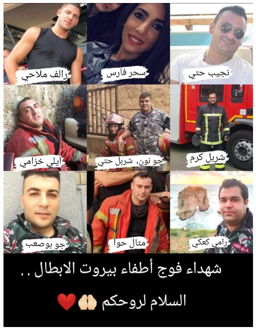 A picture of the fallen firefighters and female paramedic in Beirut, oct 2020, photo credit: Al Jazeera