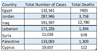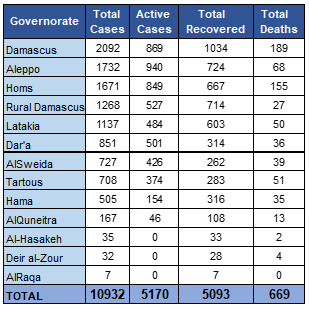 10932 laboratory-confirmed cases have been reported by the Syrian MoH: 2092 in Damascus; 1732 in Aleppo; 1671 in Homs; 1268 in Rural Damascus; 1137 in Lattakia; 851 in Dar’a; 727 in Sweida; 708 in Tartous; 505 in; Hama; 167 in Quneitra; 35 in Al-Hasakeh; 32 in Deir-Ez-Zor and 7 in Ar-Raqqa.