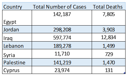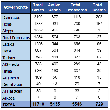 11710 laboratory-confirmed cases have been reported by the Syrian MoH : 2192 in Damascus; 1837 in Homs; 1832 in Aleppo; 1354 in Rural Damascus; 1256 in Lattakia; 887 in Dar’a; 798 in Tartous; 738 in Sweida; 536 in; Hama; 189 in Quneitra; 49 in Deir-Ez-Zor; 35 in Al-Hasakeh and 7 in Ar-Raqqa.