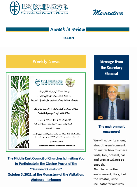 The new issue of the weekly newsletter Momentum issued by the Communication and Public Relations Department of the Middle East Council of Churches, presents the MECC invitation to participate in the closing Prayer of the "Season of Creation", on October 3, 2021, at the Monastery of the Visitation, Aintoura – Lebanon. As for the weekly message of the Secretary General Dr. Michel Abs, it was entitled “The environment once more!”.