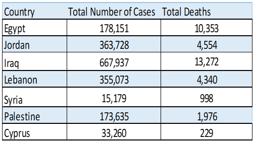 15143 laboratory-confirmed cases have been reported by the Syrian MoH : 2961 in Damascus; 2250 in Aleppo; 2248 in Homs; 2222 in Lattakia; 1465 in Rural Damascus; 1147 in Tartous; 941 in Dar’a; 843 in Sweida; 708 in Hama; 257 in Quneitra; 59 in Deir-Ez-Zor; 35 in Al-Hasakeh and 7 in Ar-Raqqa.