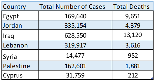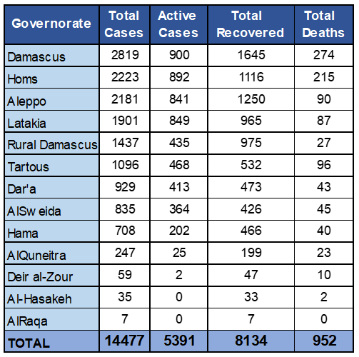 14477 laboratory-confirmed cases have been reported by the Syrian MoH : 2819 in Damascus; 2223 in Homs; 2181 in Aleppo; 1901 in Lattakia; 1437 in Rural Damascus; 1096 in Tartous; 929 in Dar’a; 835 in Sweida; 708 in Hama; 247 in Quneitra; 59 in Deir-Ez-Zor; 35 in Al-Hasakeh and 7 in Ar-Raqqa.
