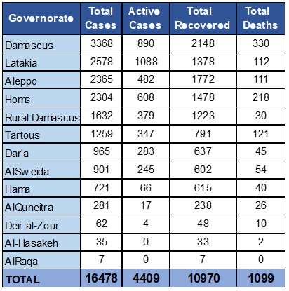 16478 laboratory-confirmed cases have been reported by the Syrian MoH : 3368 in Damascus; 2578 in Lattakia; 2365 in Aleppo; 2304 in Homs; 1632 in Rural Damascus; 1259 in Tartous; 965 in Dar’a; 901 in Sweida; 721 in Hama; 281 in Quneitra; 62 in Deir-Ez-Zor; 35 in Al-Hasakeh and 7 in Ar-Raqqa.