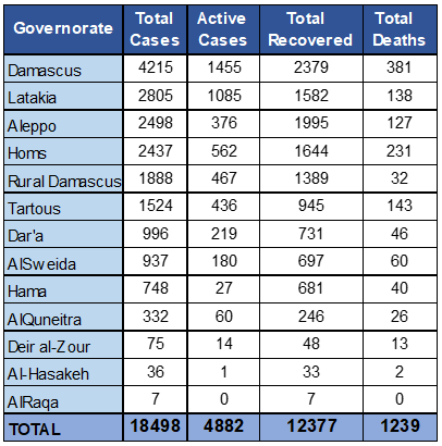 18498 laboratory-confirmed cases have been reported by the Syrian MoH : 4215 in Damascus; 2805 in Lattakia; 2498 in Aleppo; 2437 in Homs; 1888 in Rural Damascus; 1524 in Tartous; 996 in Dar’a; 937 in Sweida; 748 in Hama; 332 in Quneitra;75 in Deir-Ez-Zor; 36 in Al-Hasakeh and 7 in Ar-Raqqa.