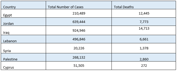 20226 laboratory-confirmed cases have been reported by the Syrian MoH : 4692 in Damascus; 3031 in Lattakia; 2662 in Aleppo; 2583 in Homs; 2127 in Rural Damascus; 1647 in Tartous; 1074 in Dar’a; 1021 in Sweida; 822 in Hama; 399 in Quneitra; 108 in Deir-Ez-Zor; 53 in Al-Hasakeh and 7 in Ar-Raqqa.