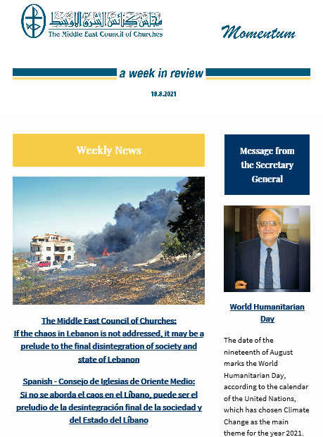 The new issue of the weekly newsletter Momentum issued by the Communication and Public Relations Department of the Middle East Council of Churches, presents the MECC statement following the explosion which occurred in the Akkar, Lebanon, region. In addition to the “Season of Creation” booklet translated into Arabic for the first time by MECC, and the visit of the Environmental and Theological committee to HE Bishop Elias Audi. As for the weekly message of the Secretary General Dr. Michel Abs, it was entitled " World Humanitarian Day".