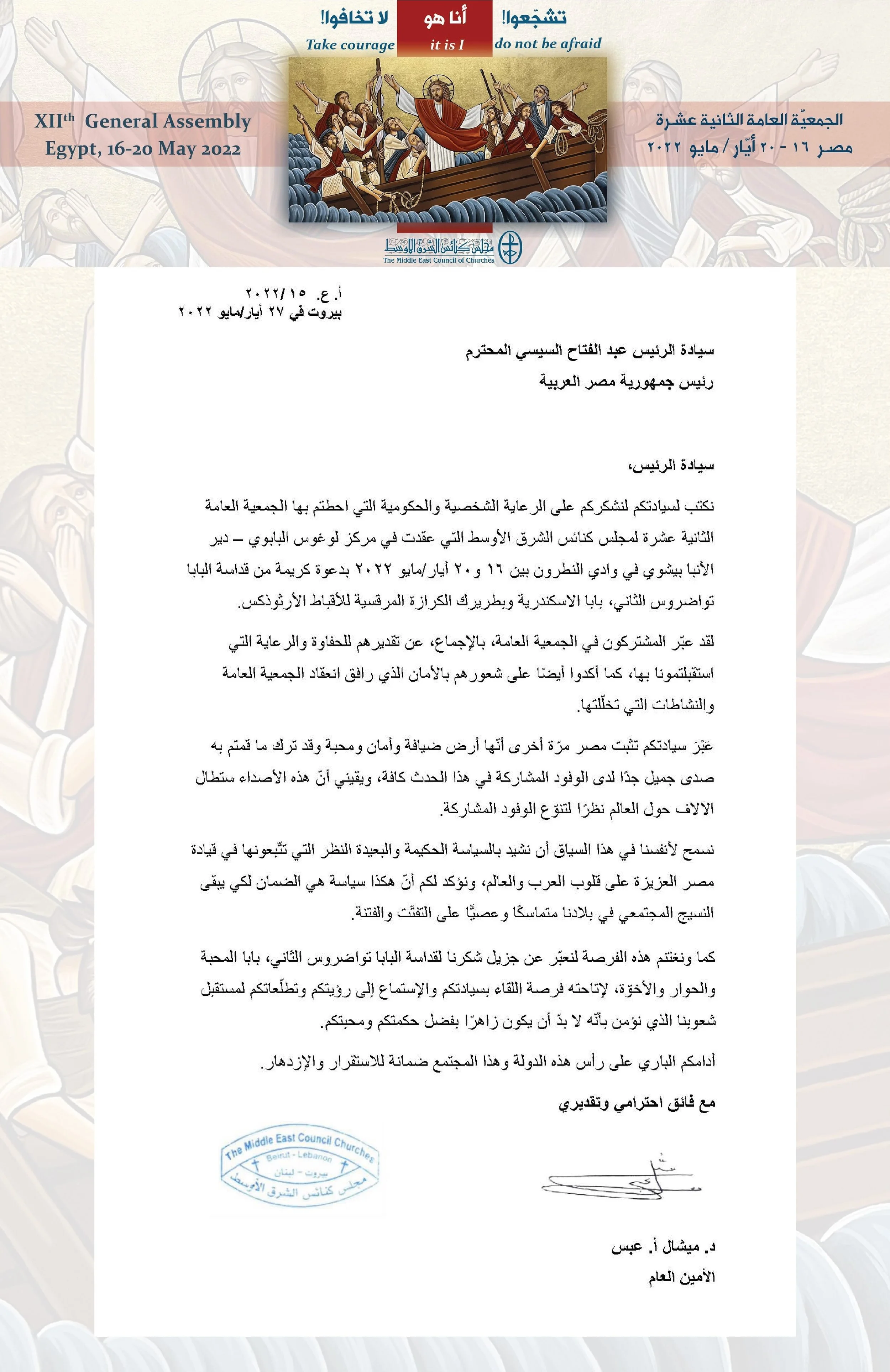 A Thank you letter from the MECC Secretary General Dr. Michel Abs to the President of the Arab Republic of Egypt, Mr. Abdel Fattah Al-Sisi, following the MECC 12th General Assembly hosted by the Coptic Orthodox Church under the patronage of His Holiness Pope Tawadros II, Pope of Alexandria and Patriarch of the See of St. Mark, at the Logos Papal Center in Wadi El Natrun in Egypt, under under the title of "Take courage, it is I; do not be afraid" (Matthew 14: 27).