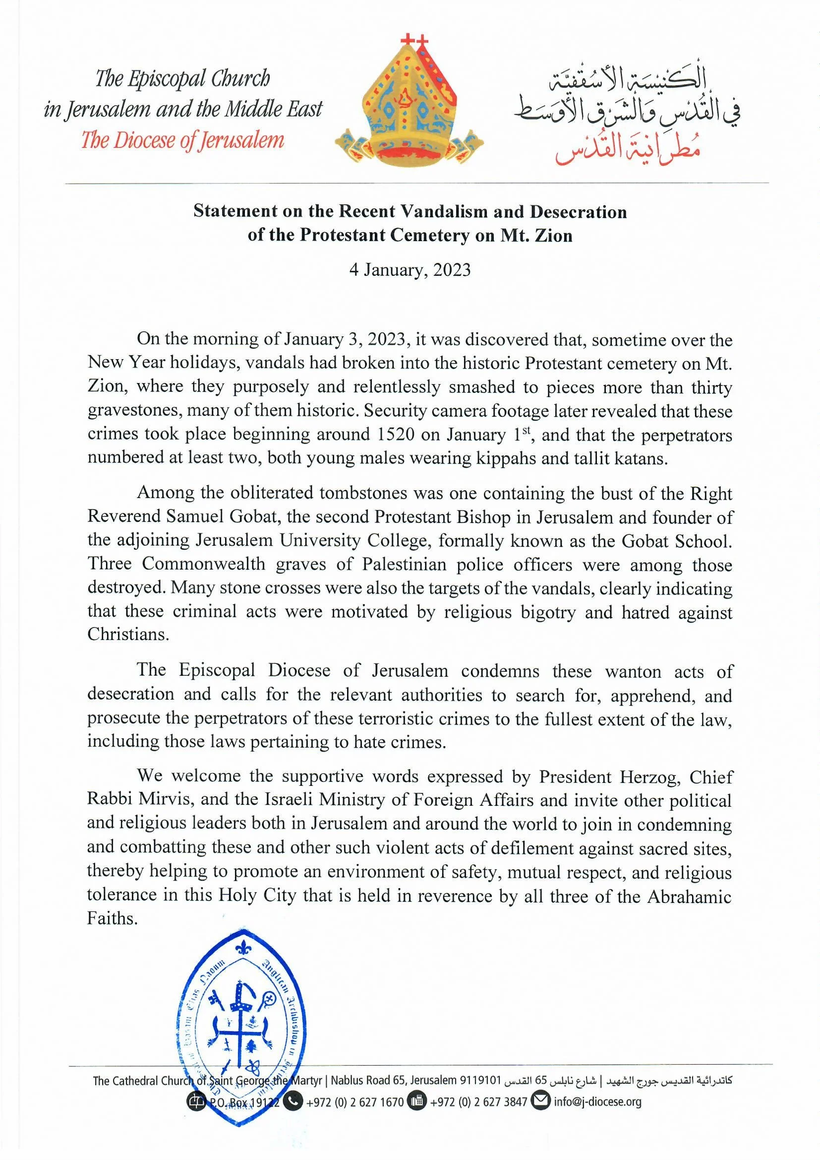 Following the recent vandalism and desecration of the Protestant Cemetery on Mt. Zion, the Episcopal Diocese of Jerusalem headed by His Eminence Archbishop Hosam Naoum, Archbishop of the Episcopal Church, Diocese of Jerusalem, issued a statement, on Wednesday 4 January 2023, in which it condemns these acts of desecration and calls the relevant authorities to search for, apprehend, and prosecute the perpetrators of these crimes.