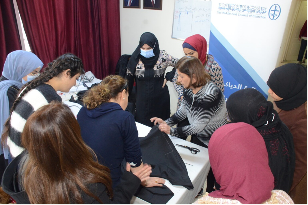 From among twenty Iraqi, Syrian, Egyptian, and Jordanian women, two special needs young women were selected by the local church priest to attend a three-month training course offered by the Middle East Council of Churches in Jordan. A first-time experience for our team, we were nervous and unsure of how best to work with them. We wanted to be sure they did not accidentally hurt themselves on a needle, scissors, or the sewing machine.