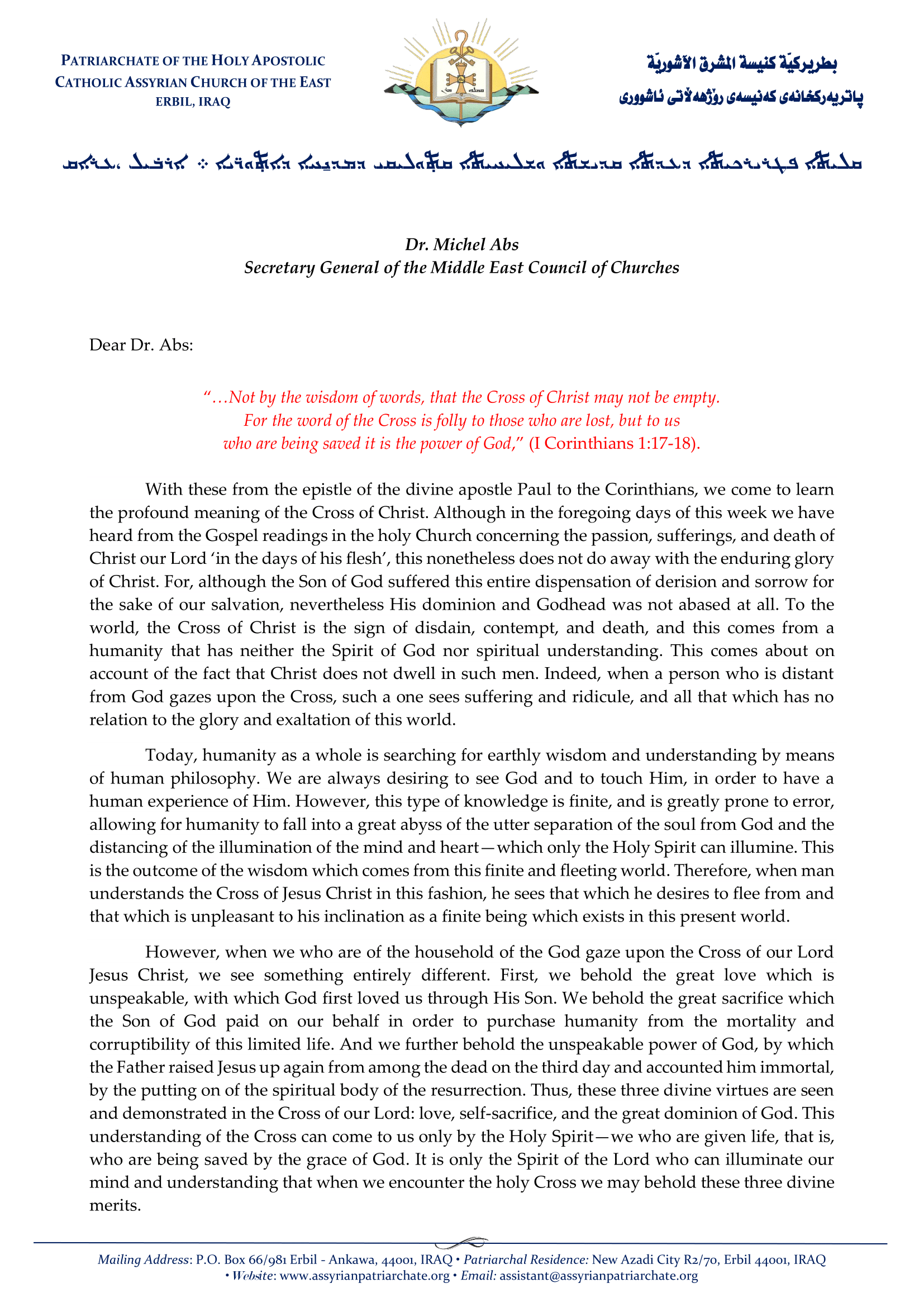 On the Occasion of Easter, His Holiness Patriarch Mar Awa III Royel, Catholicos – Patriarch of the Assyrian Church of the East, sent a letter to the Secretary General of the Middle East Council of Churches Dr. Michel Abs.