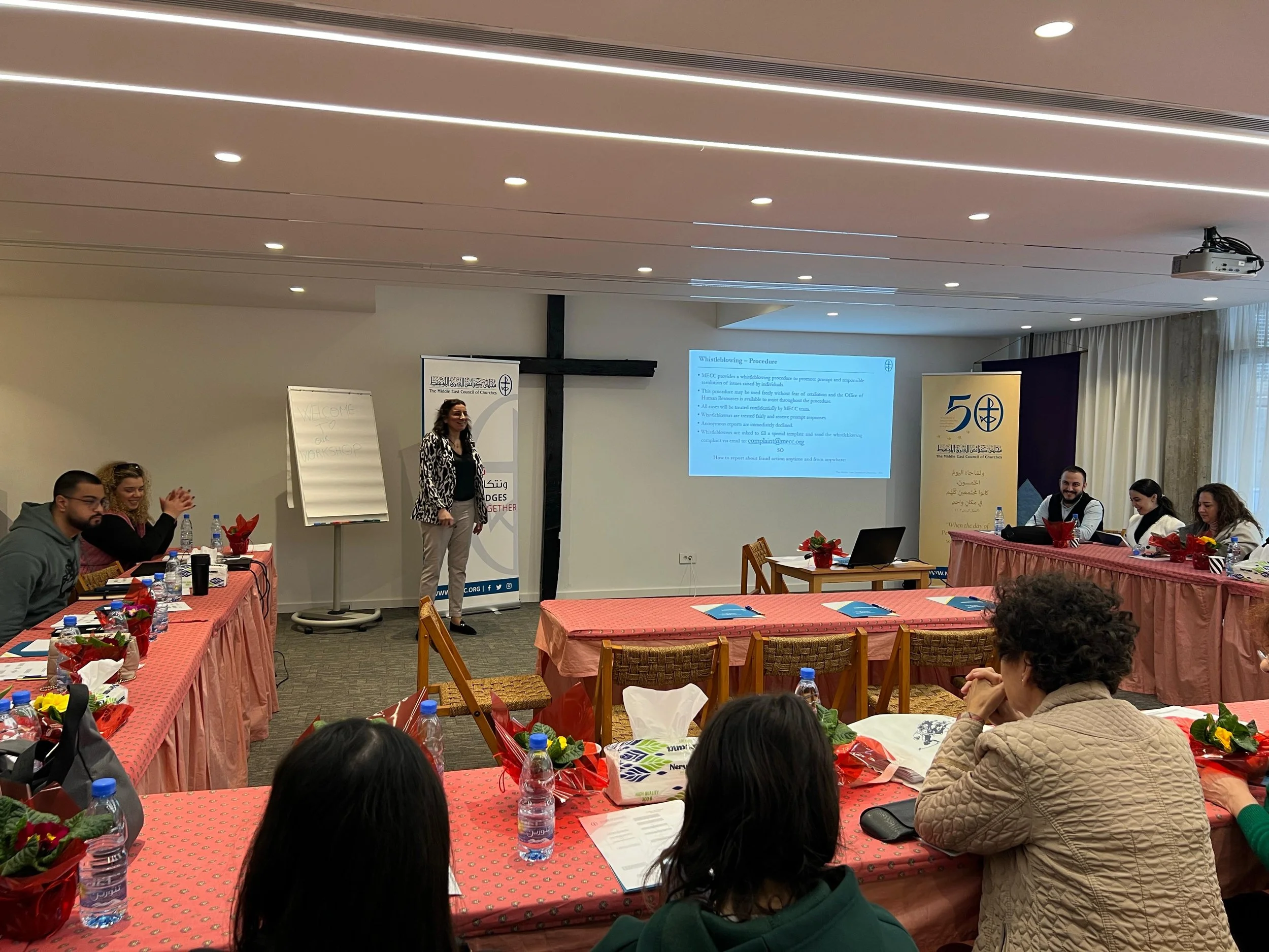 The training was moderated by the MECC Human Resources Senior Officer Mrs. Roula Saliba, in which participants were the team of the MECC General Secretariat in Beirut, and the team of our Lady Dispensary, affiliated with the MECC, in the Sabtieh region –Mount Lebanon. Hence, the training included many sessions and practical exercises, all of which centered, in details, on the policies and procedures for the recruitment process, employee files and all issues related to their duties, rights and performance. In addition, the training highlighted the policies and procedures related to whistleblowing, and the protection from sexual exploitation, abuse, and harassment (PSEAH)…