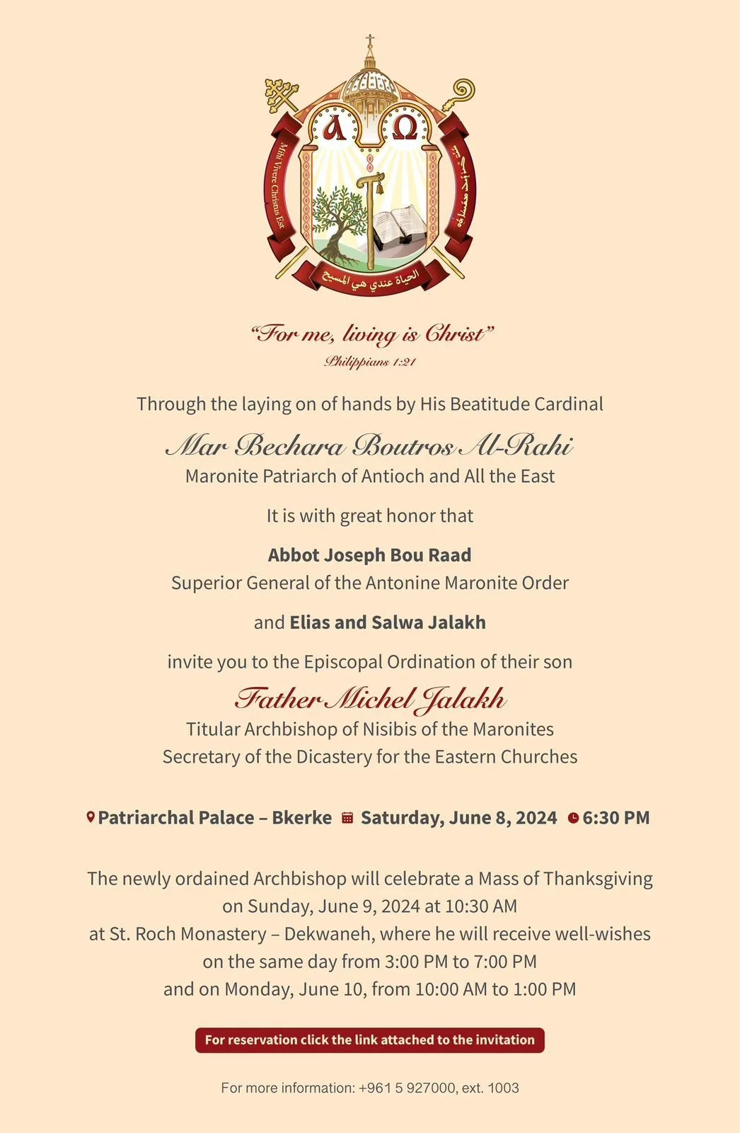 Through the laying on of hands by His Beatitude Cardinal Mar Bechara Boutros Al-Rahi, Maronite Patriarch of Antioch and All the East, it is with great honor that Abbot Joseph Bou Raad, Superior General of the Antonine Maronite Order, and Elias and Salwa Jalakh, invite you to the Episcopal Ordination of their son Father Michel Jalakh, Titular Archbishop of Nisibis of the Maronites, Secretary of the Dicastery for the Eastern Churches, and Honorary President of the Middle East Council of Churches (MECC), on Saturday, June 8, 2024, 6:30 PM, at the Patriarchal Palace – Bkerke, Lebanon.