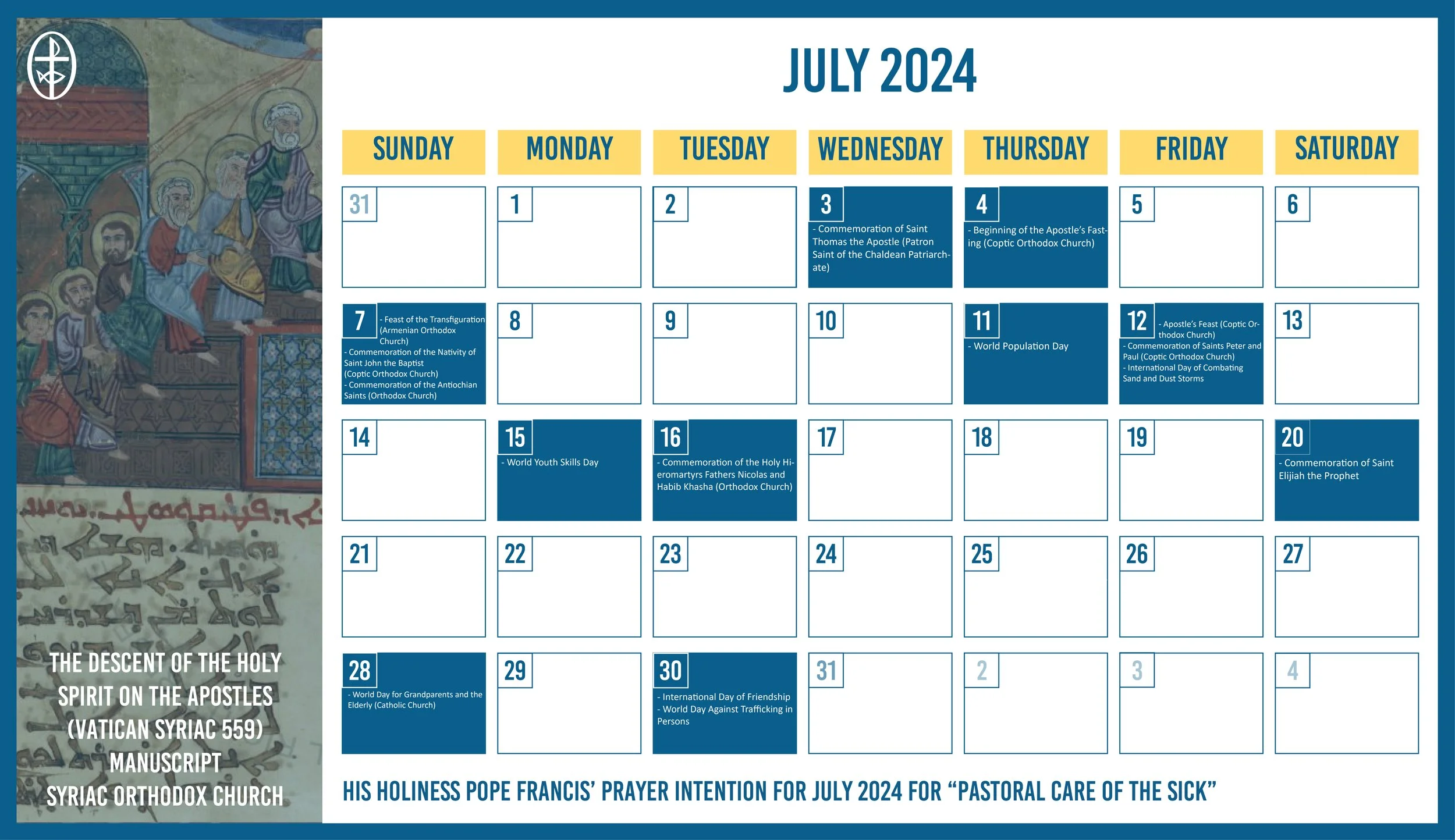 The Middle East Council of Churches (MECC), Communication and Public Relations Department, have now issued its online Ecumenical calendar for the month of July 2024. It includes the Ecclesiastical and Liturgical feasts of the various families of Churches in the Middle East. In addition to international days identified by the United Nations, and which are related to the MECC identity and its spiritual and human mission.