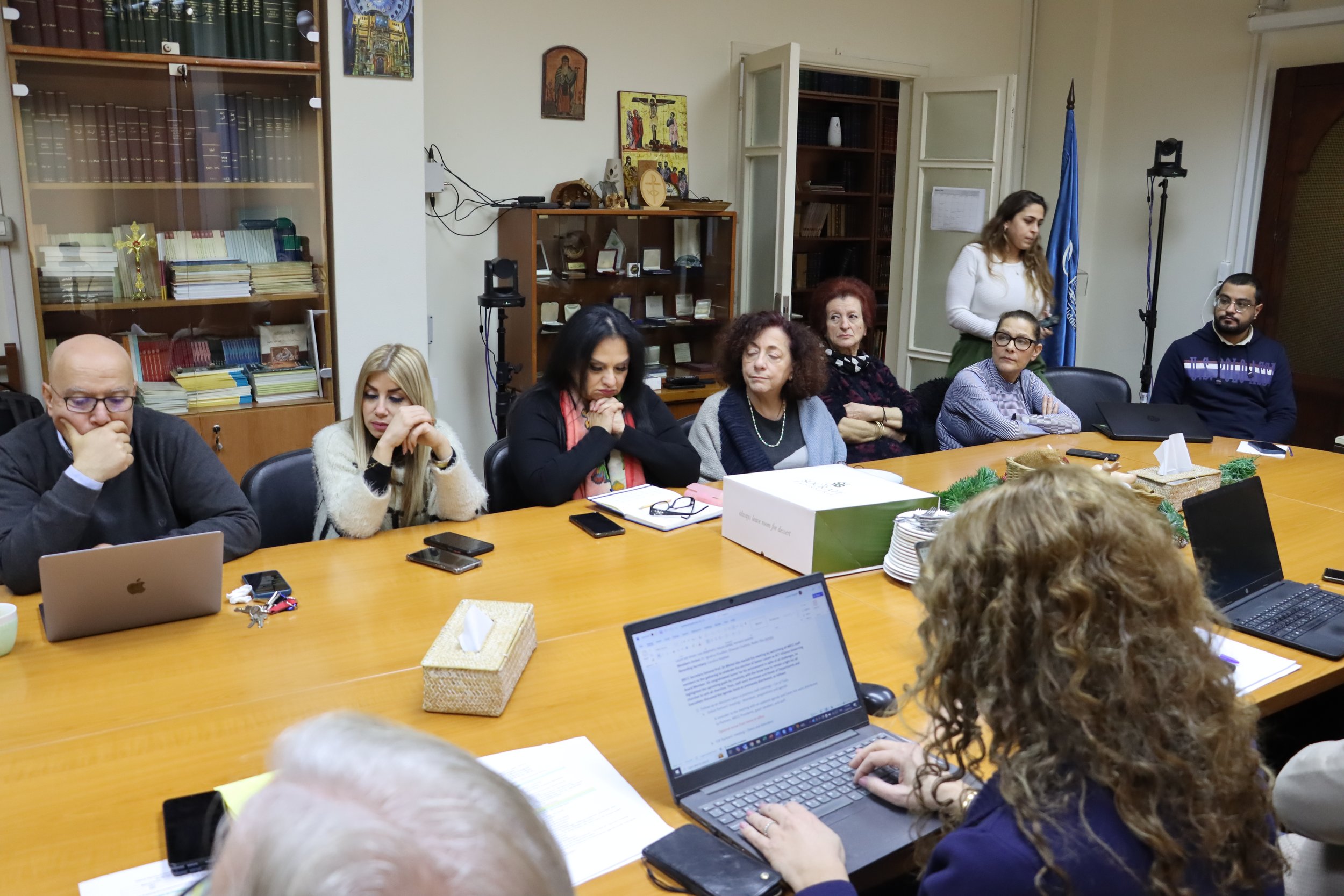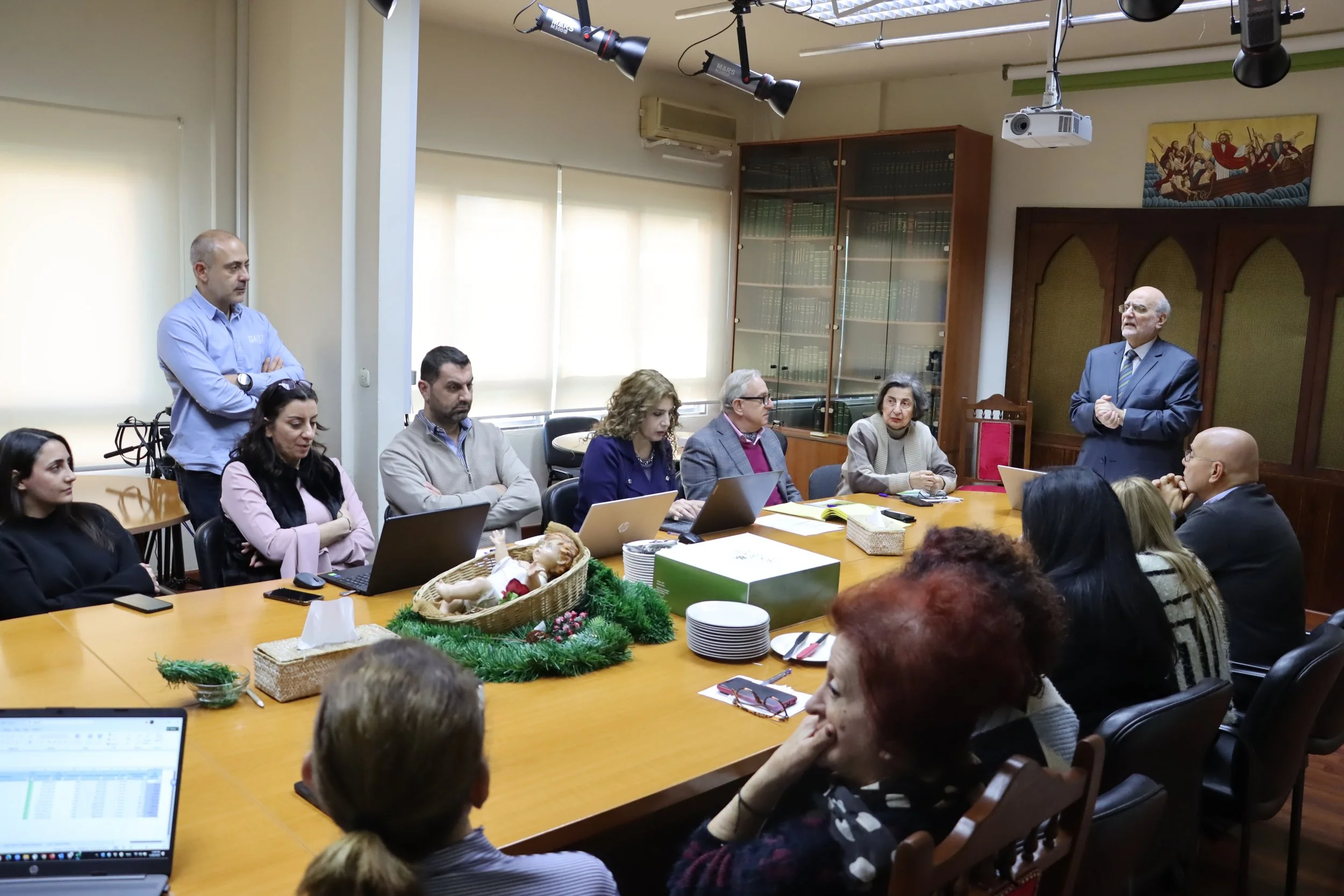 With the completion of the achievements for the year 2024 and preparation for the entitlements in the new year, the Secretary General of the Middle East Council of Churches (MECC) Professor Dr. Michel Abs, held a general meeting for the MECC General Secretariat team, entitled progress and success in International forums. The meeting was held on the occasion of the election of the MECC candidate Eng. Samer Laham, Director of the MECC Diakonia and Social Service Department, as a member of the new Governing Board of the International ACT Alliance.