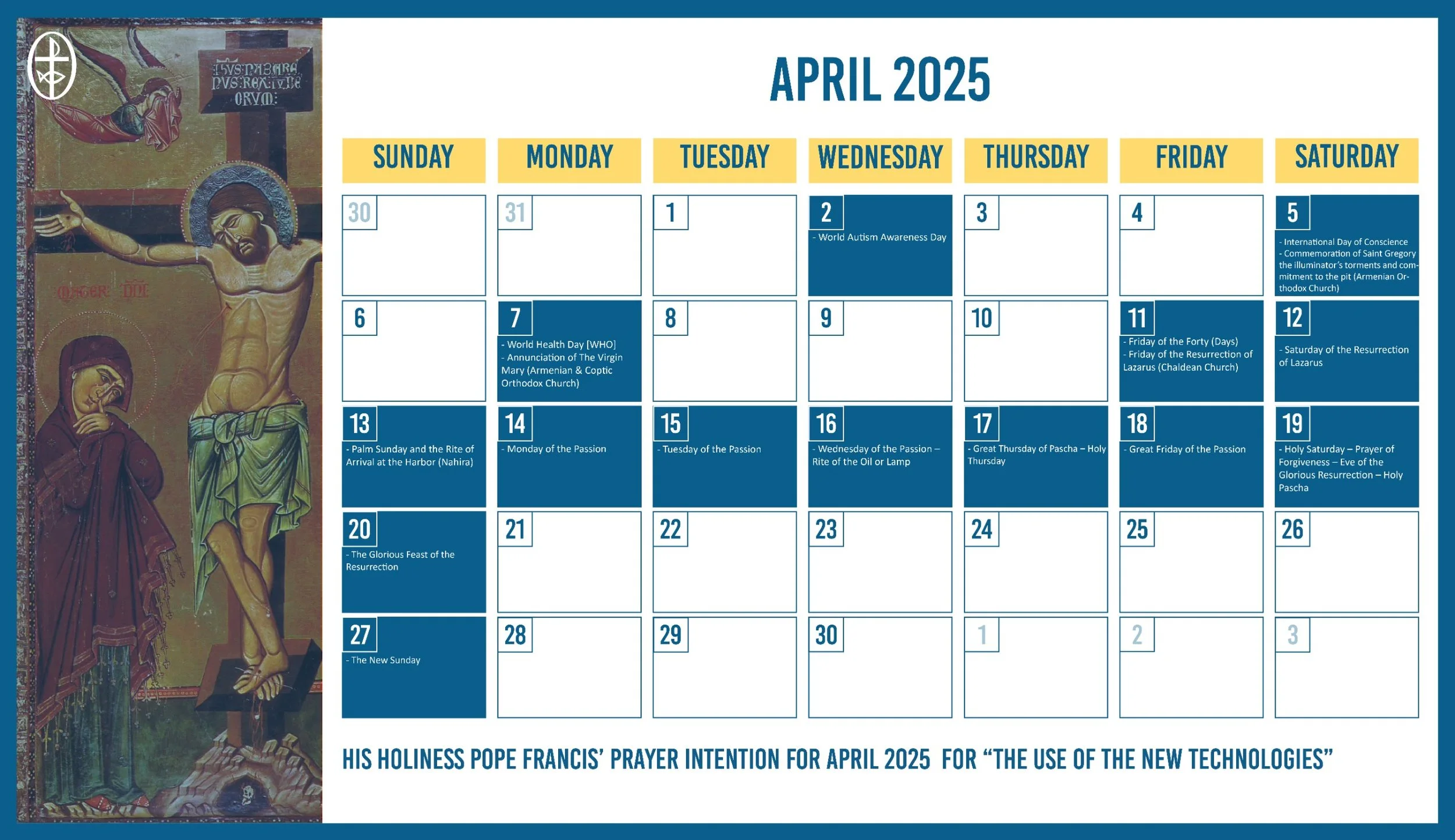 The Middle East Council of Churches (MECC) have now issued its online Ecumenical calendar for the month of April 2025. It includes the Ecclesiastical and Liturgical Feasts of the various Families of Churches in the Middle East. In addition to international days identified by the United Nations, and which are related to the MECC identity and its spiritual and human mission.