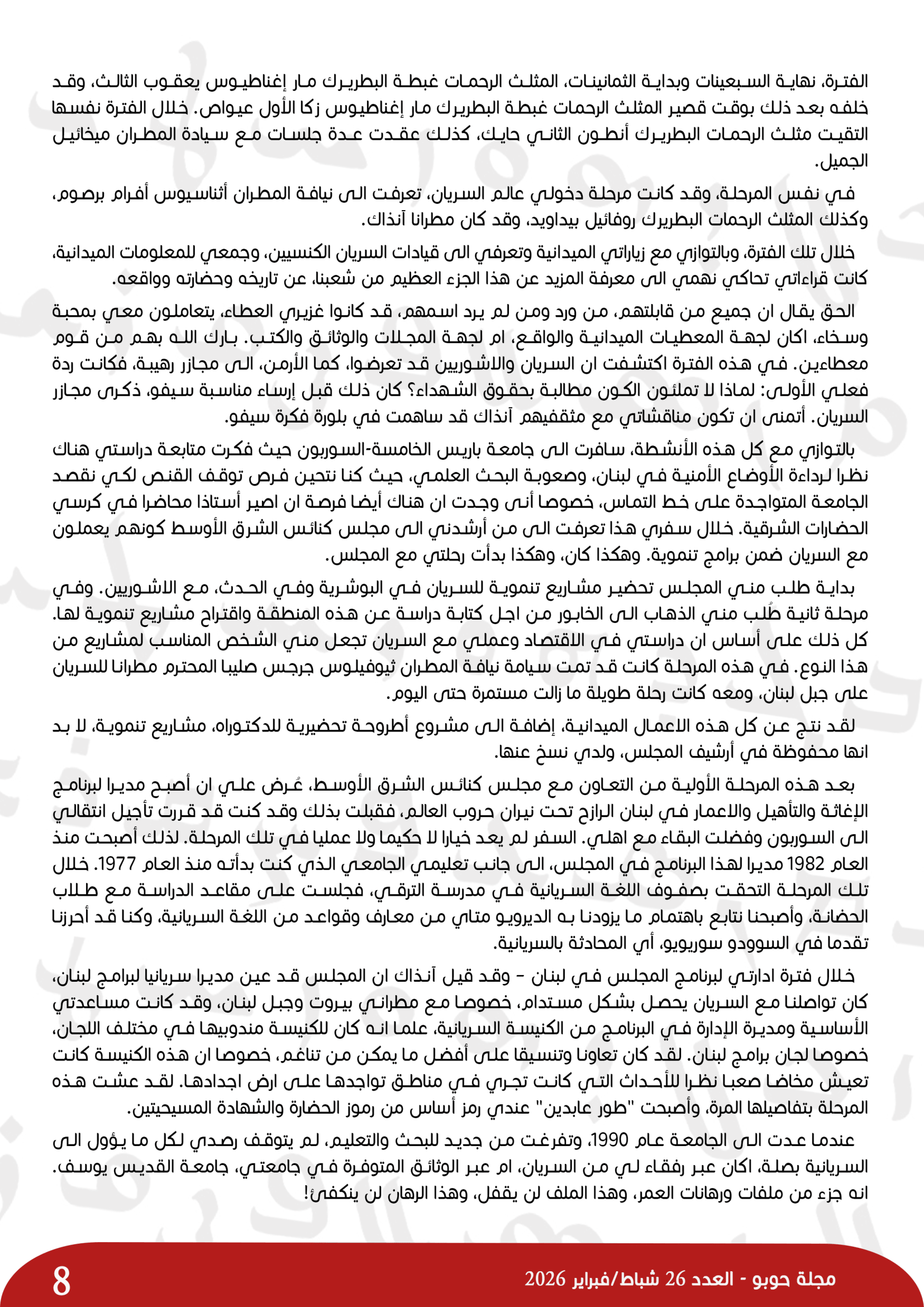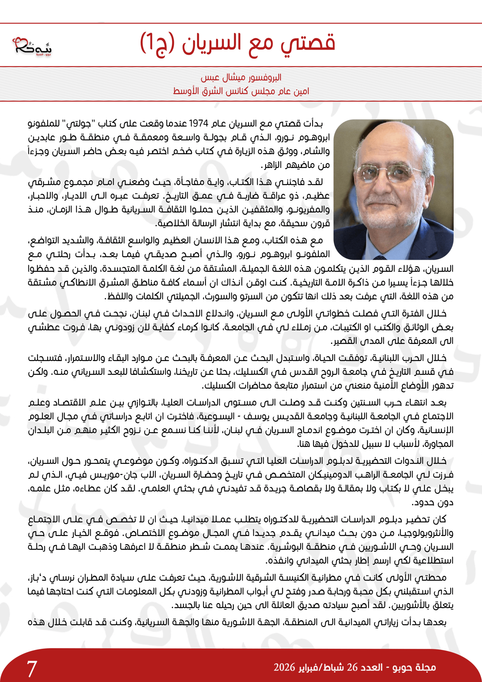 A new media collaboration between the Middle East Council of Churches (MECC) and "Hoobo" (meaning "Love") Magazine, issued by the Virgin Mary Syriac Orthodox Church in Cairo, is launched with the publication of a new article written by the MECC Secretary General Professor Michel Abs, entitled "My Story with the Syriacs (Part 1)," in issue 26, February, Year 3, 2026. In the article, Professor Abs presents a part of his relation and history with the Syriac people.
