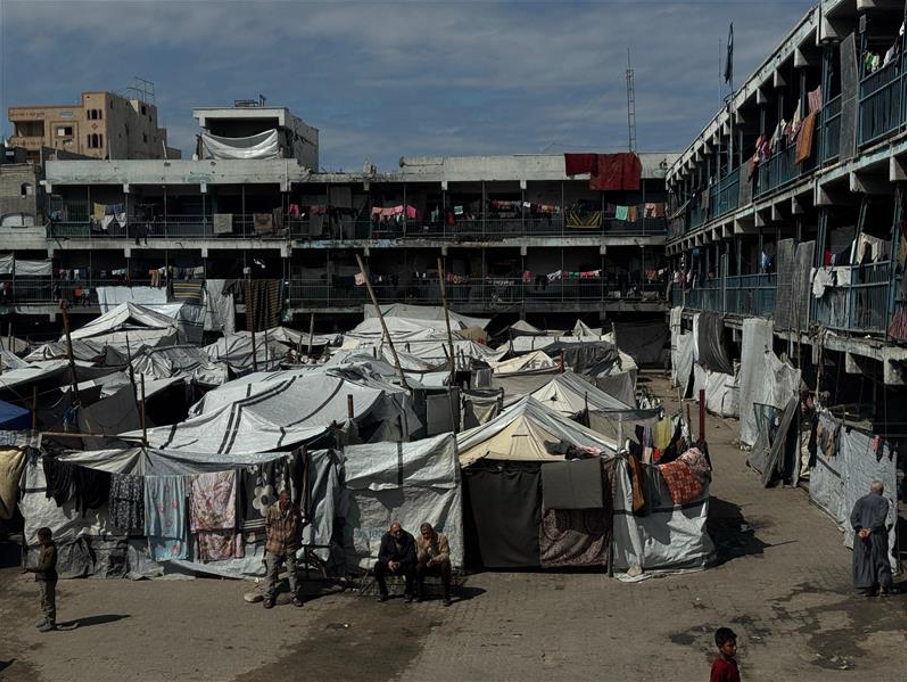 نازحون في غزّة يعيشون في خيام مؤقّتة داخل مدرسة تابعة للأونروا تحوّلت إلى ملجأ. الحقوق محفوظة للأونروا، نيسان/ أبريل 2026 - Displaced families living in makeshift tents in an UNRWA school-turned-shelter in Gaza © April 2026 UNRWA Photo