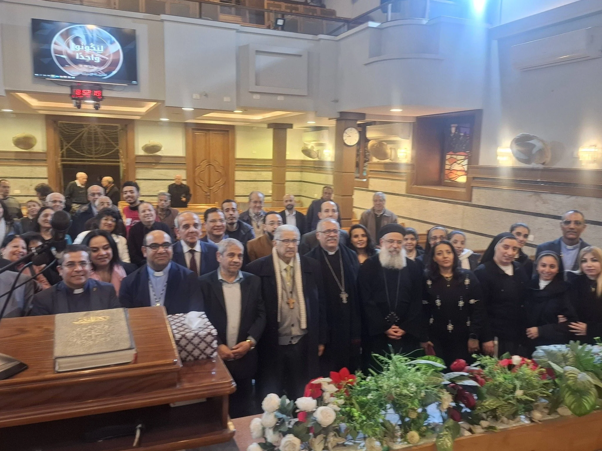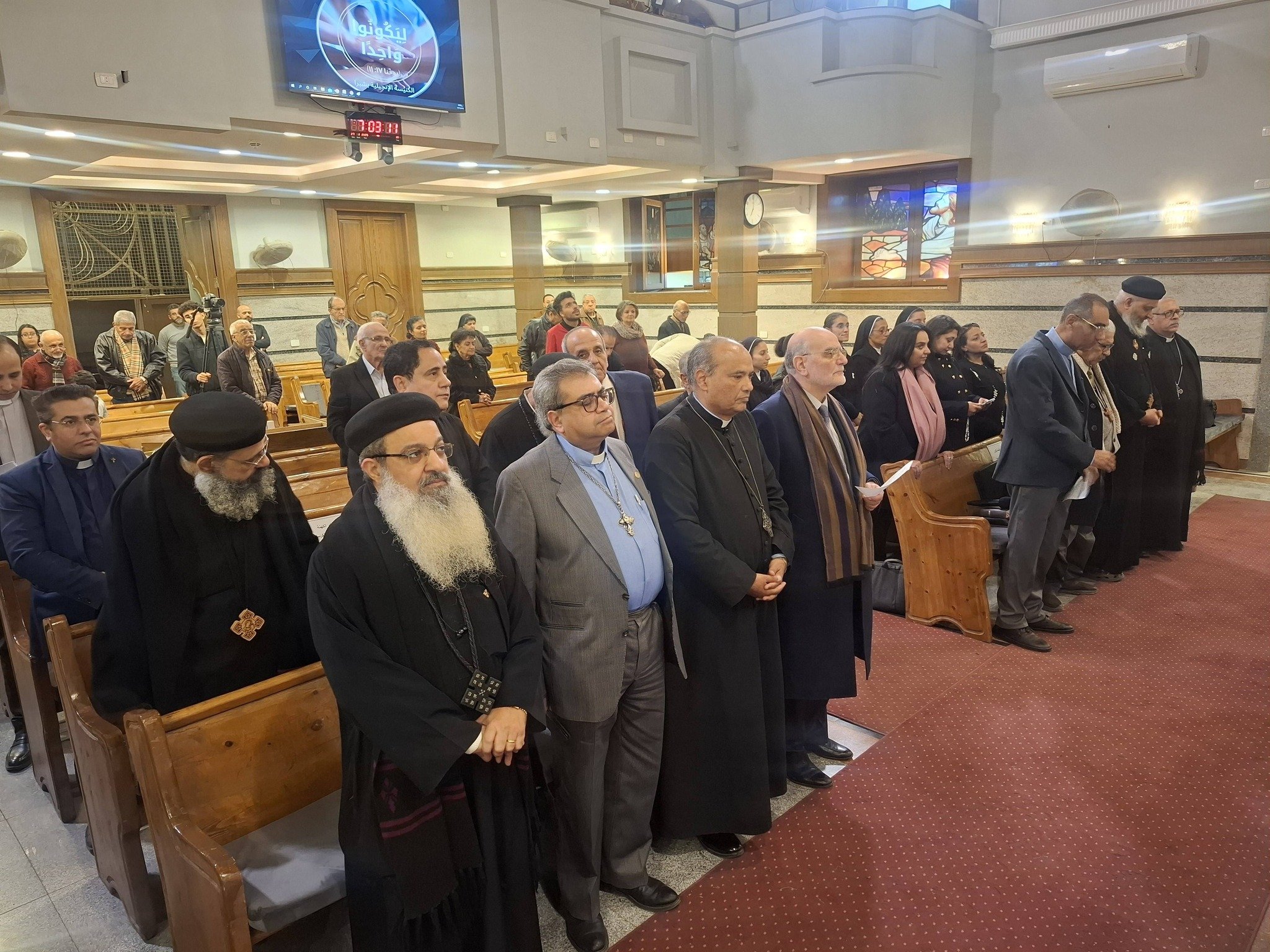 Attendees were Priests and Pastors from various Churches in Egypt, Secretary General of the Middle East Council of Churches (MECC) Professor Michel Abs, Secretary General of the Egyptian Council of Churches Reverend Yeshua Yacoub, Secretary General of the Middle East Council of Churches (MECC) Reverend Refaat Fikry, Honorary Secretary General of the Middle East Council of Churches (MECC) Dr. Gergis Saleh, Coordinator of Social Cohesion, Dialogue, and Human Dignity Programs Professor Laure Abi Khalil, Coordinator of Church Relations and Media at MECC Journalist Lea Adel Maamary, as well as Nuns, Members of the Week of Prayer Committee, and Believers.