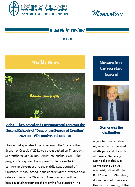 The new issue of the weekly newsletter Momentum issued by the Communication and Public Relations Department of the Middle East Council of Churches, presents the full video of the second episode of the “Days of the Season of Creation” on Télé Lumière and Noursat prepared by the Department; as well as the promotion video of the third episode’s topics and guests. As for the weekly message of the Secretary General Dr. Michel Abs, it was entitled "Bkerke was the destination".