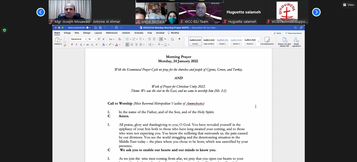 لذا ولمناسبة "أسبوع الصّلاة من أجل وحدة المسيحيّين" 2022، إتّحد مجلس الكنائس العالميّ ومجلس كنائس الشرق الأوسط في الصّلاة، بدعوة من فريق المركز المسكونيّ العالميّ في جنيف وتنظيم مشترك مع دائرة الشؤون اللّاهوتيّة والعلاقات المسكونيّة في الأمانة العامّة لمجلس كنائس الشرق الأوسط.