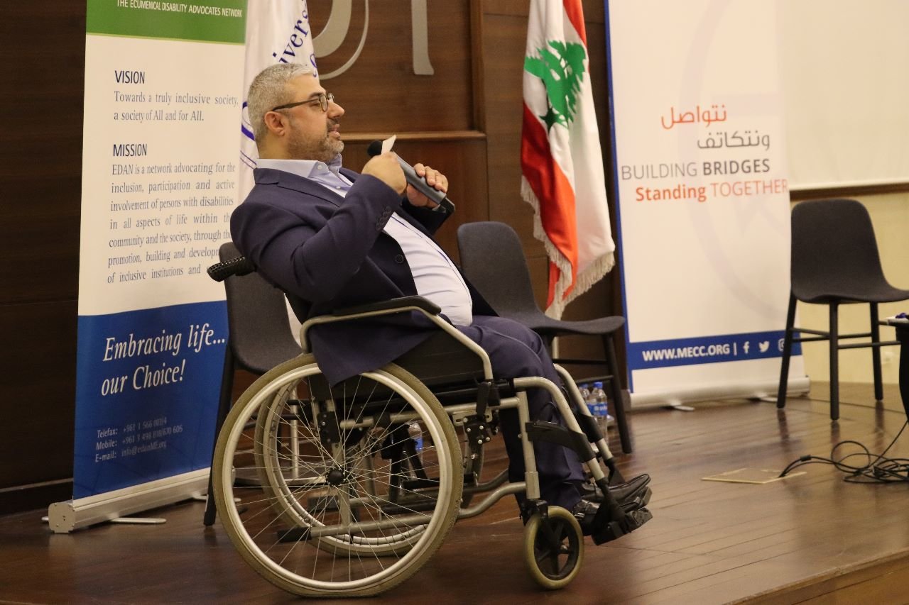 أضاف "تاريخ مجلس كنائس الشرق الأوسط عريق في التعامل مع الإعاقة، إذ كنّا السبّاقين إلى تأسيس مراكز تأهيل المعوّقين في لبنان خلال فترة الحرب... كان المجلس ذو فعاليّة في كافّة الأنشطة في لبنان والمنطقة في مجال الإعاقة، إذ كان مشاركًا في كلّ هيئات التنسيق للتعامل مع الإعاقة كما كان يقدّم الدعم للعديد من مؤسّسات الإعاقة، من الحاجات الصغيرة الآنية إلى الدعم الطويل الأمد بما فيه البناء."