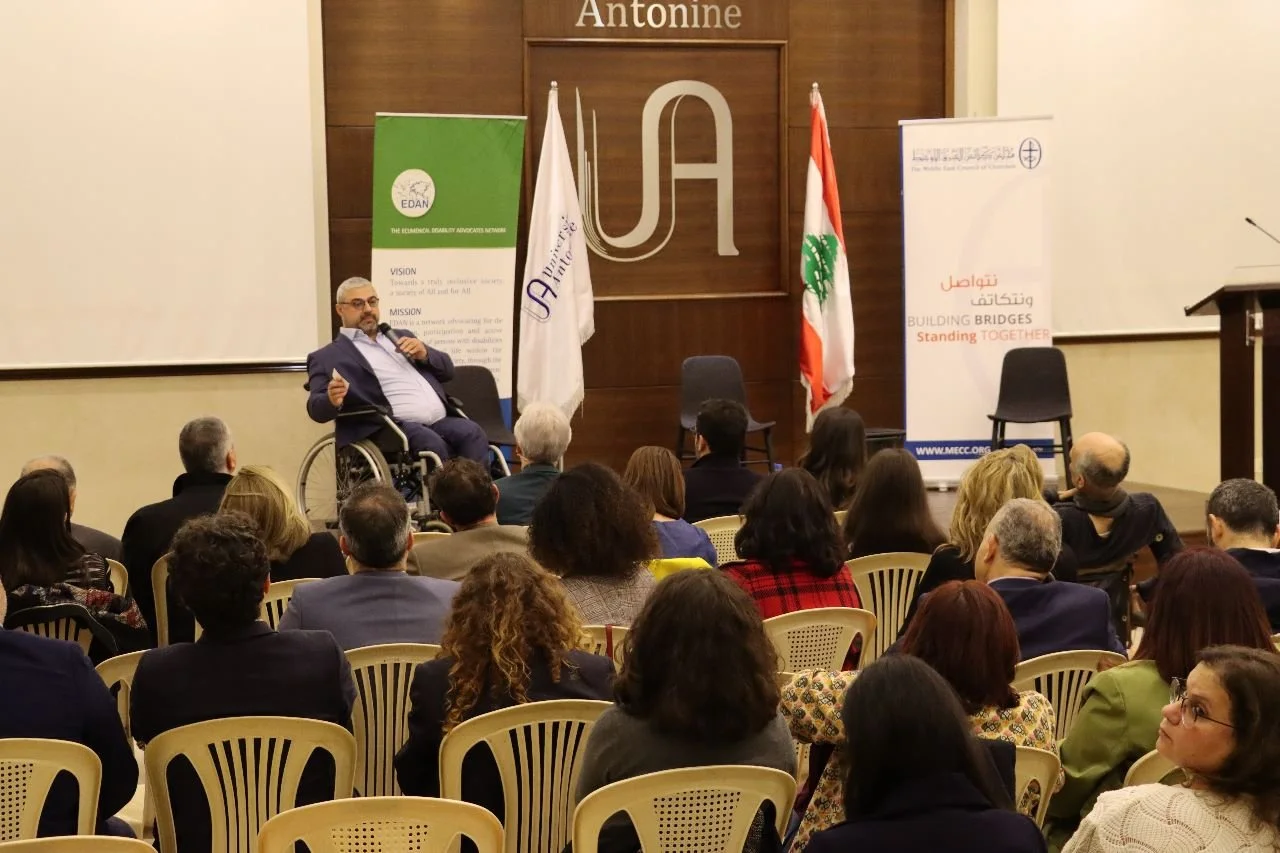 في إطار تعزيز الوعي في مسألة الإعاقة ومفاهيمها في العالم العربيّ، نُظّمت ندوة حول كتاب "مسألة الإعاقة في العالم العربي، خريطة طريق للمستقبل" الصّادر حديثًا، بدعوة من الشبكة الجامعة لمناصرة الأشخاص المعوّقين EDAN، بالشراكة مع مجلس كنائس الشرق الأوسط، وذلك يوم الجمعة 16 كانون الأوّل/ ديسمبر 2022، في الجامعة الأنطونيّة في لبنان، بمشاركة رئيس الجامعة الأب ميشال جلخ والأمين العام لمجلس كنائس الشرق الأوسط د. ميشال عبس، إلى جانب أشخاص من ذوي الإعاقة، أكاديميّين، متخصّصين وضيوف من مختلف المجالات.