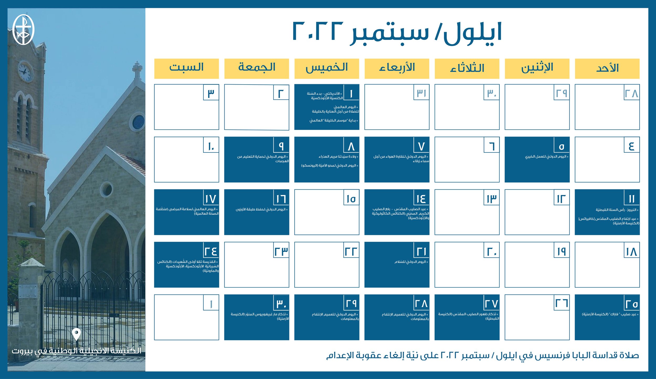 أعدّت دائرة التواصل والعلاقات العامة في مجلس كنائس الشرق الأوسط الرزنامة المسكونيّة الإلكترونيّة لشهر أيلول/ سبتمبر 2022. تضمّ الرزنامة الأعياد الكنسيّة واللّيتورجيّة الخاصّة بمختلف العائلات الكنسيّة في الشرق الأوسط إضافةً إلى الأيّام الدوليّة المحدّدة من قبل الأمم المتّحدة والّتي تتوافق مع هويّة المجلس ورسالته الرّوحيّة والإنسانيّة، على أن تنشر باقي أشهر السّنة تباعًا.