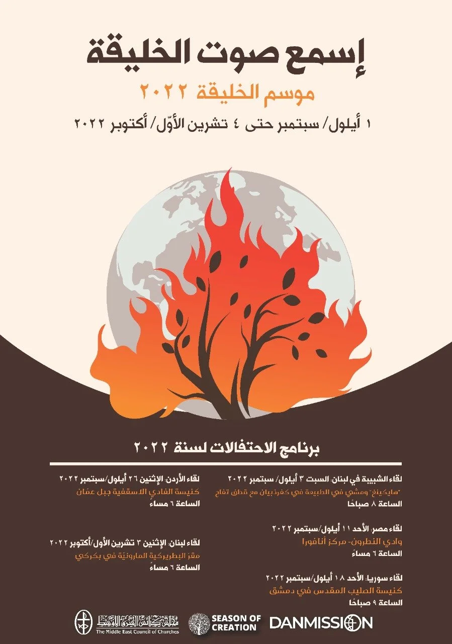 في إطار فعاليّات "موسم الخليقة" 2022، الّذي حمل هذه السّنة موضوع "إسمع صوت الخليقة"، وشعار "العلّيقة المشتعلة"، يدعوكم مجلس كنائس الشرق الأوسط وأمينه العام د. ميشال عبس، بالشّراكة مع منظّمة "دانمشن" Danmission ، للمشاركة هذه السّنة بسلسلة الإحتفالات الّتي تُقام في مختلف دول الشرق الأوسط وفق البرنامج التالي. لنصلّ معًا إلى الربّ الخالق ونستمع إلى صوت كلّ مخلوق يعلن مجده وبهائه!