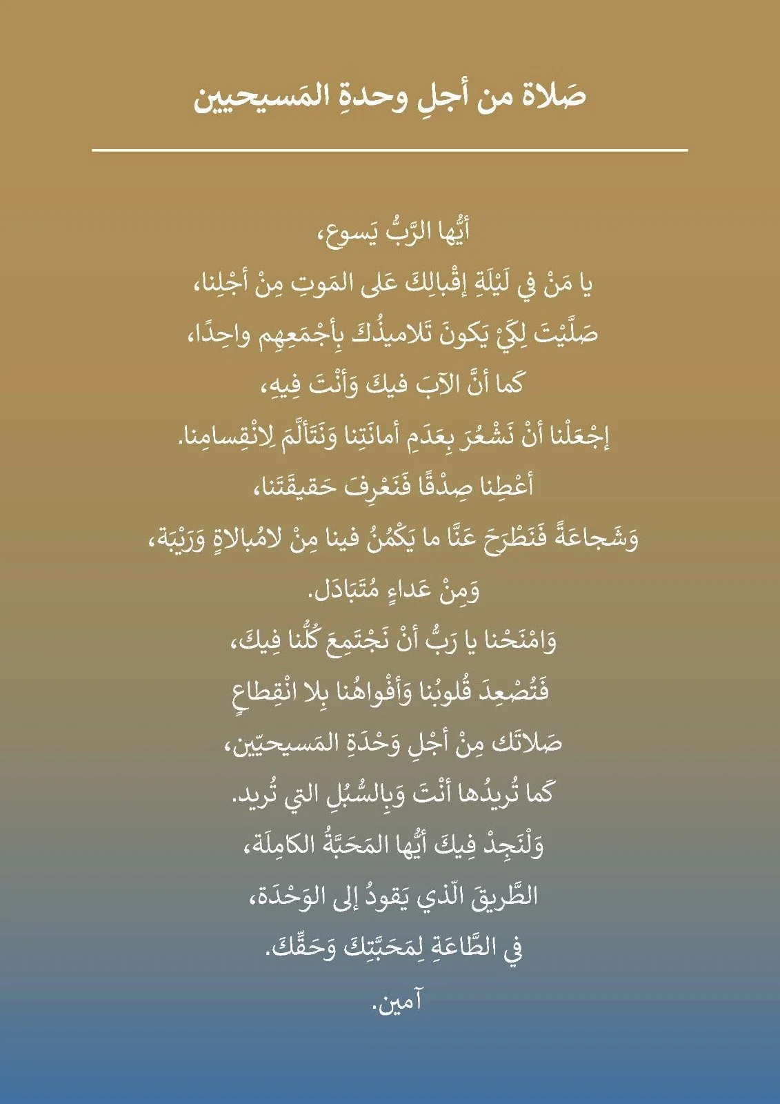 تجدون في التالي نصّ الصّلاة الخاصّة من أجل وحدة المسيحيّين.