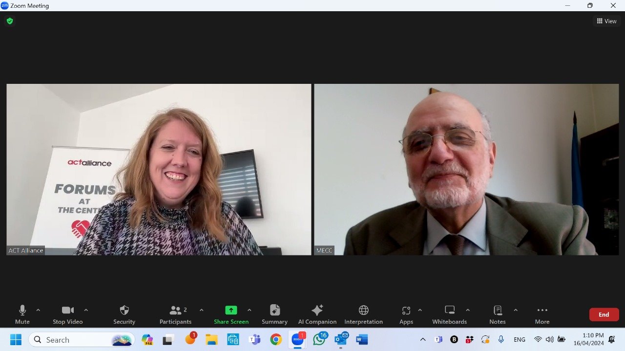 في إطار تعزيز العلاقات المسكونيّة بين مجلس كنائس الشرق الأوسط وشركائه، عقد الأمين العام لمجلس كنائس الشرق الأوسط د. ميشال عبس اجتماعًا عن بُعد مع ممثّلة المنظّمة العالميّة "آكت اللّاينس" ACT Alliance في الشرق الأوسط وشمال أفريقيا السيّدة راشيل لوس، يوم الثلاثاء 16 نيسان/ أبريل 2024.