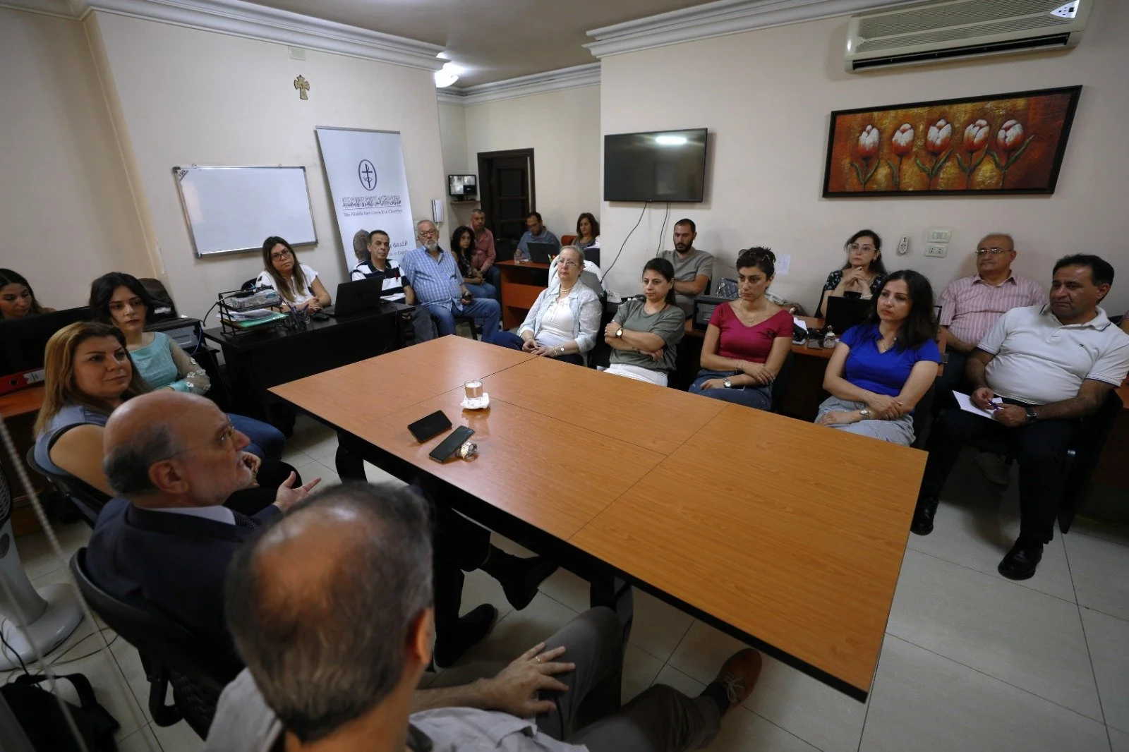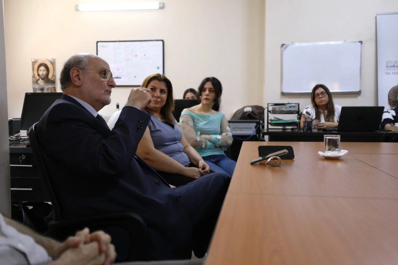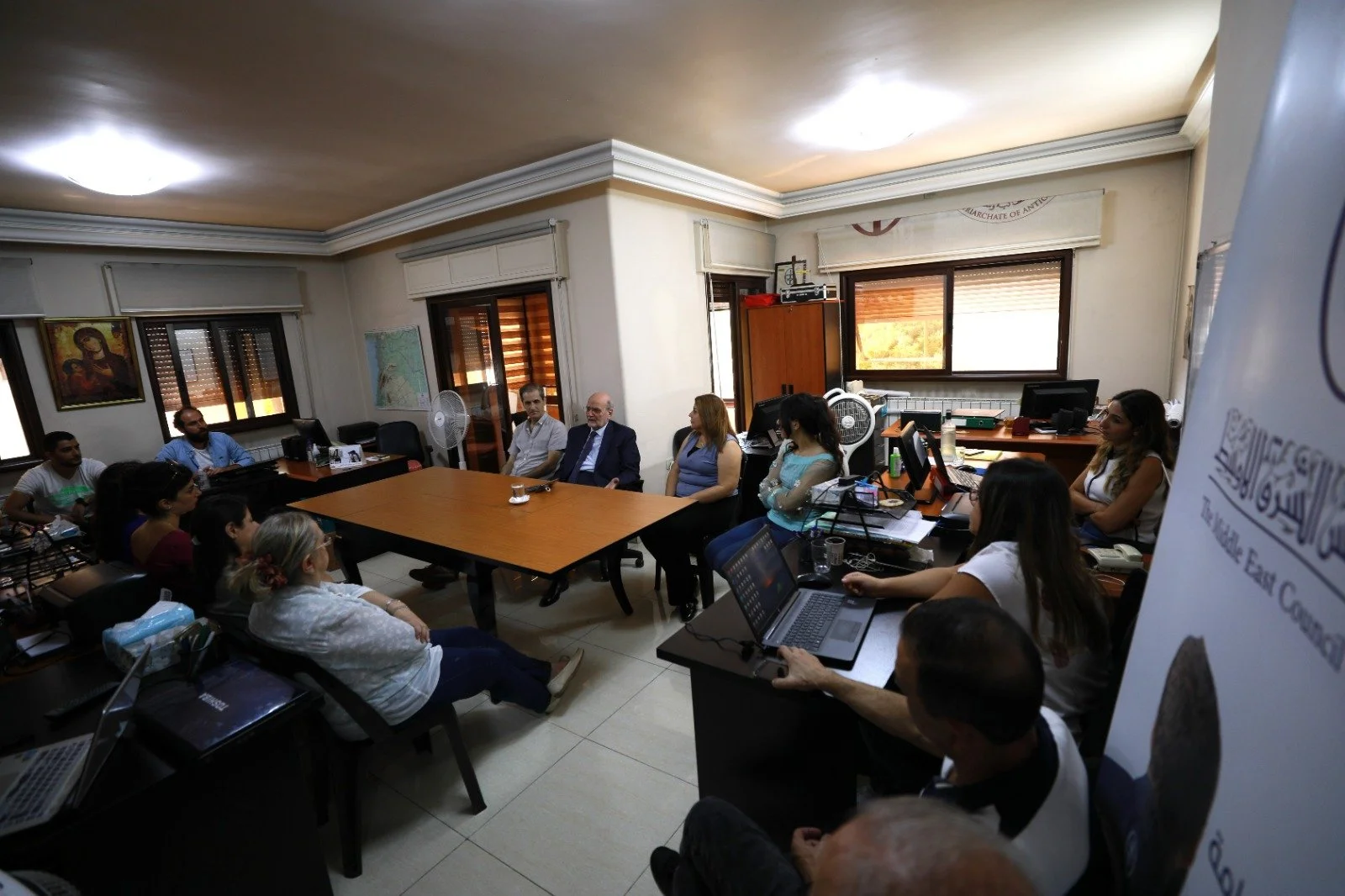 ثمَّ تحدث الدكتور ميشال عبس إلى فريق مكتب دمشق، وقدّم شرحاً عن الأهداف والاستراتيجيات المستقبلية للمشاريع التي ينفذها مجلس كنائس الشرق الأوسط، والتي يعتبر أهمها مشروع البعد الزراعي الكنسي وهو عبارة عن مجمعات سكنية ريفية تتعامل مع الزراعة والحرف، والهدف منه هو مساعدة الكنيسة على الصمود في وجه هجرة المسيحيين، إذ أنه عندما يتم تأمين السكن والطعام للإنسان فإنه لن يفكر في هجرة وطنه.