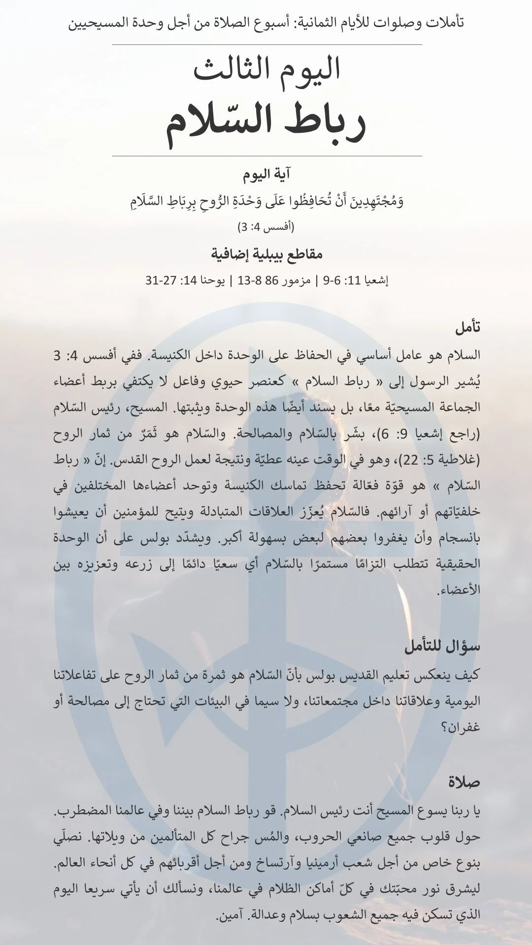 في هذا الإطار، تجدون الصّلوات والتأمّلات والقراءات اليوميّة باللّغتين العربيّة والإنكليزيّة الخاصّة بأسبوع الصلاة لعام 2026 والّتي وردت في الكتيّب حيث بإمكانكم نشرها وتوزيعها كلّ يوم بيومه.