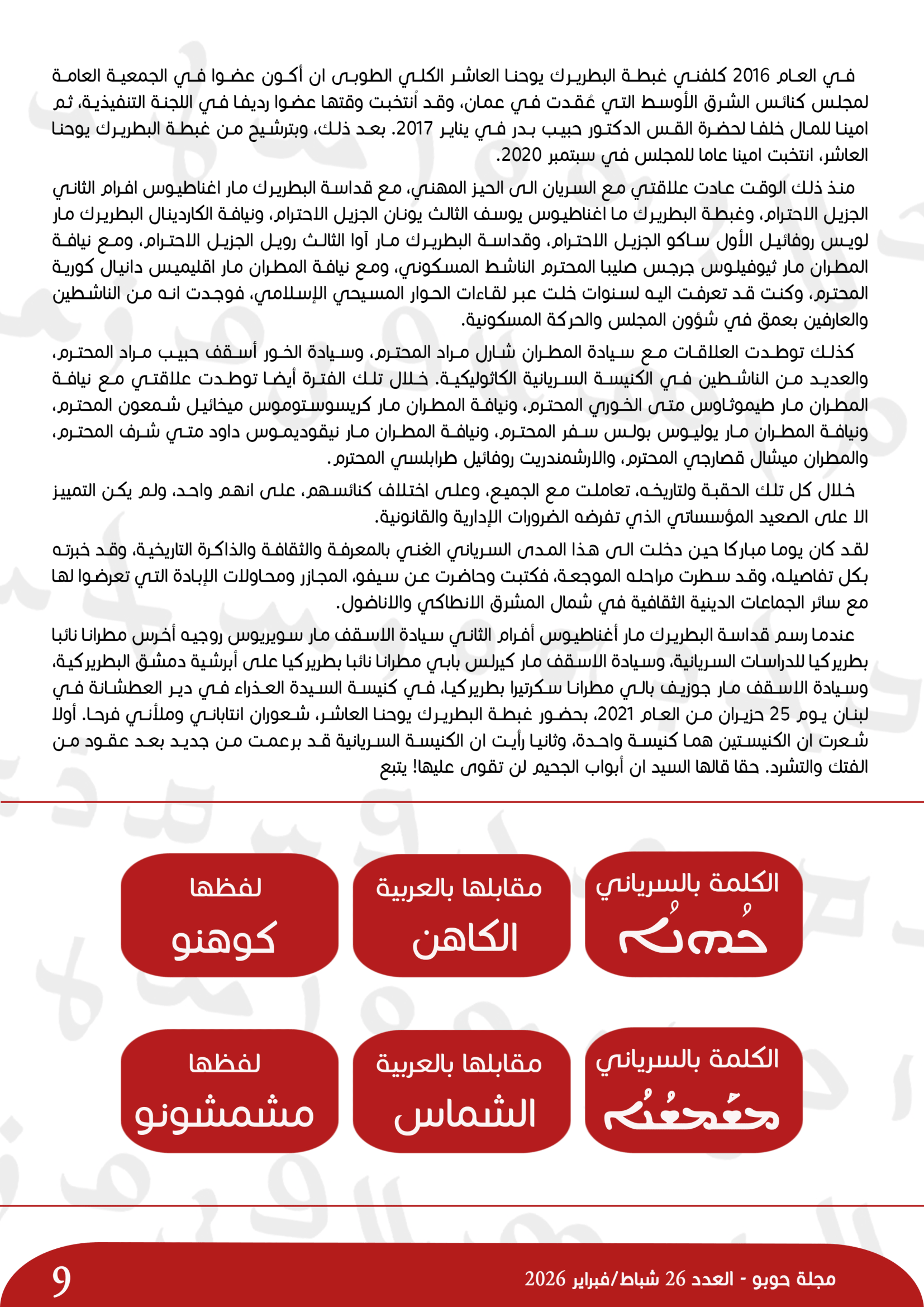 ينطلق التعاون الإعلامي الجديد بين مجلس كنائس الشرق الأوسط ومجلّة "حوبو" أي "المحبّة"، الصادرة عن كنيسة السيّدة العذراء مريم للسريان الأرثوذكس في القاهرة، وذلك عبر نشر مقال جديد للأمين العام للمجلس البروفسور ميشال عبس، بعنوان "قصتي مع السريان (ج1)"، في العدد 26، شباط/ فبراير، السنة الثالثة 2026. يعرض البروفسور عبس في المقال جزءًا من علاقته وتاريخه مع السريان.