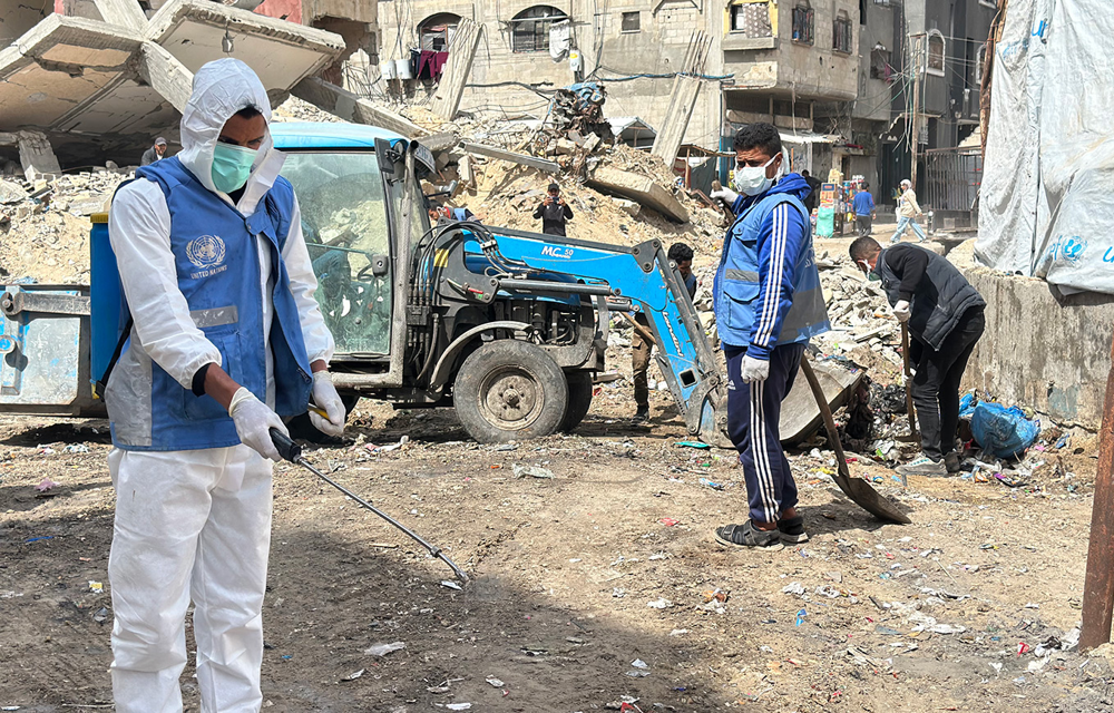 يواصل عمّال الصحّة البيئيّة التابعة للأونروا في قطاع غزة العمل يوميًّا لتنظيف المخيّمات وإزالة النفايات من الشوارع والملاجئ والحدّ من المخاطر الصحية. الحقوق محفوظة للأونروا، نيسان 2026/ UNRWA sanitation workers in the Gaza Strip teams continue work daily to clean camps, remove waste from streets and shelters, and reduce health hazards. © April 2026 UNRWA Photo.