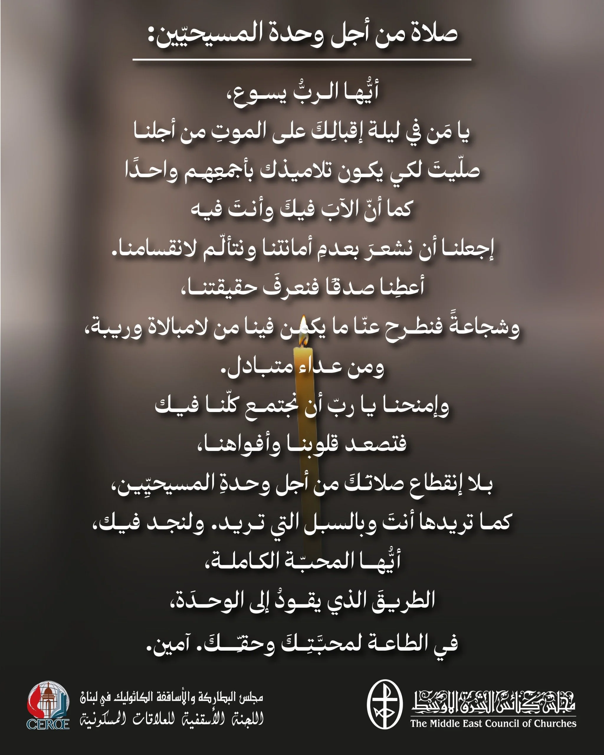 مع احتفالنا بـ"أسبوع الصّلاة من أجل وحدة المسيحيّين" 2026، نتّحد معًا في الصلاة إلى الربّ يسوع المسيح، على نيّة وحدة المسيحيّين ومن أجل السلام في الشرق الأوسط والعالم، حاملين عنوان السنة "إنّ الجسدَ واحد والرّوحَ واحد، كما دُعيتُم أيضًا برَجاء دعوتكم الواحد" (أفسس 4: 4).