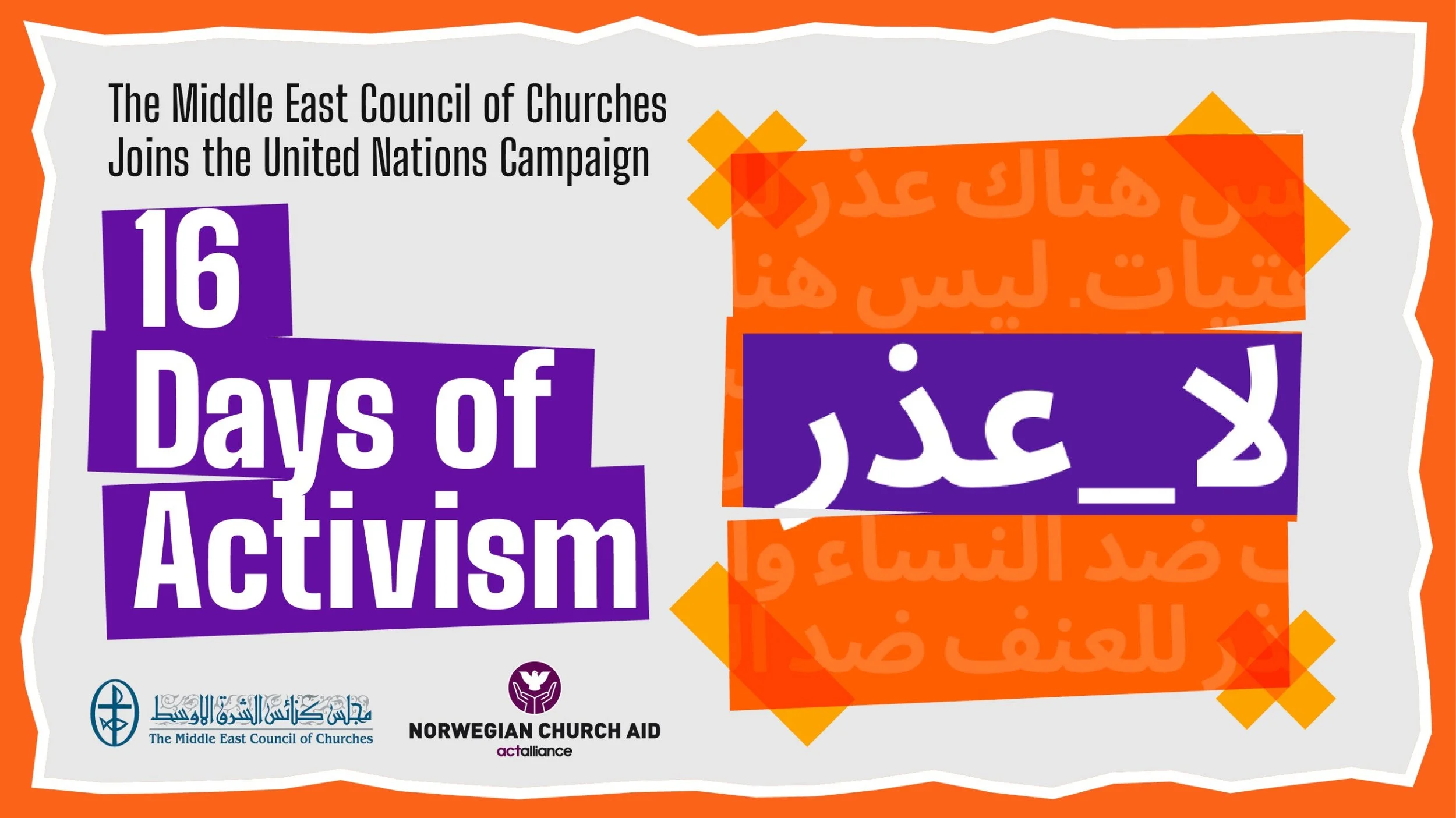 بدوره، ينضمّ مجلس كنائس الشرق الأوسط إلى هذه الحملة الّتي تحمل هذه السنة شعار "لا عذر"، وذلك تشديدًا على ضرورة مواجهة العنف ضدّ المرأة وصون كرامة الإنسان وعلى أهميّة دور الرجل في حماية العائلة والمساهمة في بناء مجتمعات أفضل. وهذا ما أكّد عليه في الفيديو المستفيدات والمستفيدون من الخدمات الّتي يقدّمها مستوصف السيدة العذراء في بيروت والتابع لمجلس كنائس الشرق الأوسط.