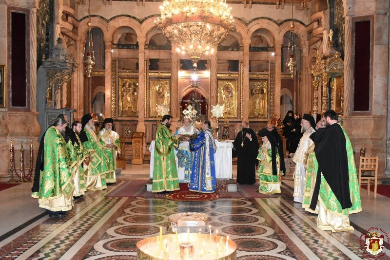 On the morning of the feast, the Service of the Sanctification of the water was observed at the Catholicon of the Church of the Holy Sepulchre by His Beatitude Greek Orthodox Patriarch of Jerusalem Theophilos III, with the co-celebration of their Eminences the Archbishops, Aristarchos of Constantina, Theodosios of Sebastia, Philoumenos of Pella and Metropolitan Joachim of Helenoupolis and Hagiotaphite Hieromonks with first in rank the Elder Kamarasis Archimandrite Nectarios. The chanting was delivered by the Byzantine singers, Hierodeacon Simeon and Mr Vasilios Gotsopoulos.