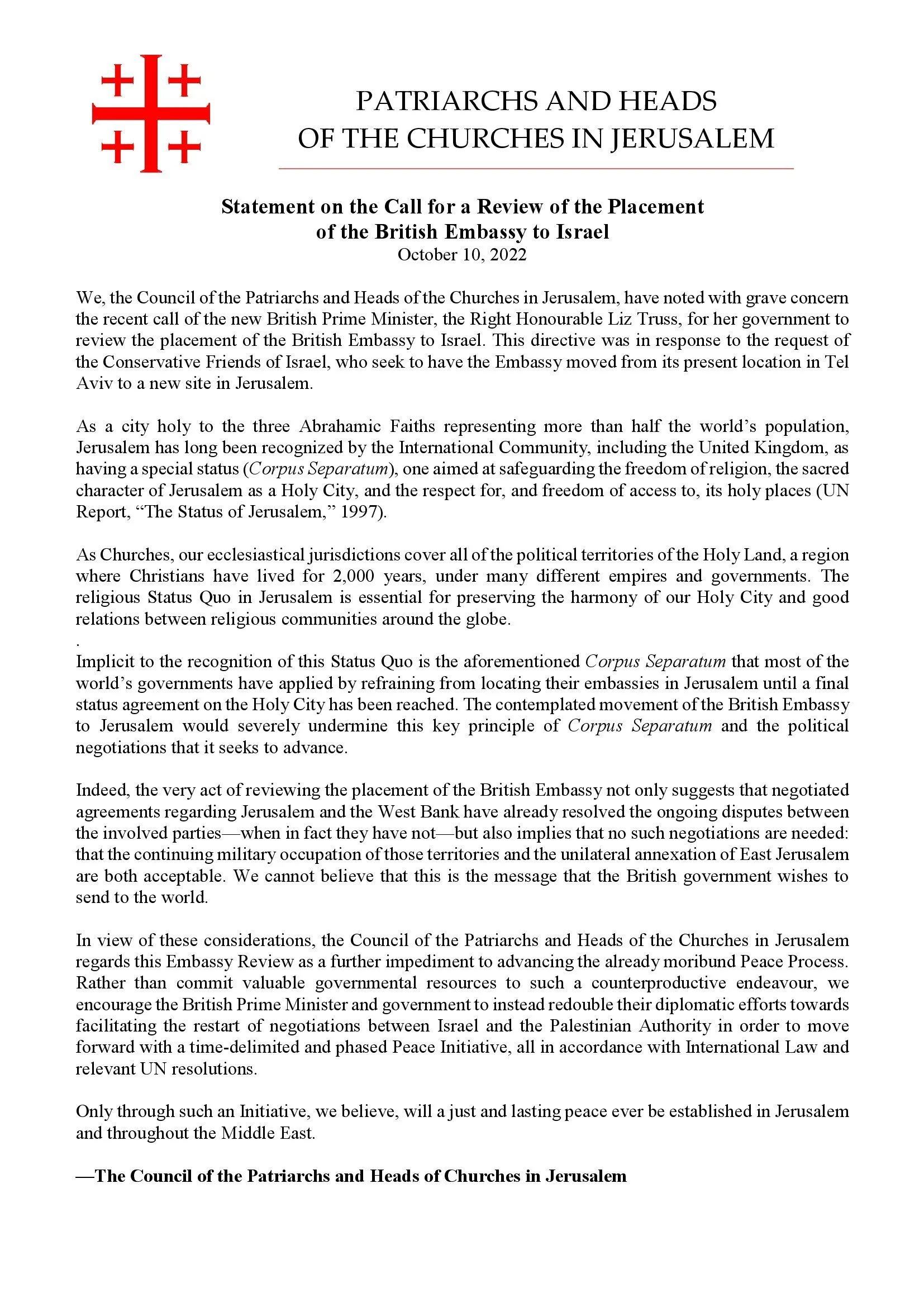 We, the Council of the Patriarchs and Heads of the Churches in Jerusalem, have noted with grave concern the recent call of the new British Prime Minister, the Right Honourable Liz Truss, for her government to review the placement of the British Embassy to Israel.