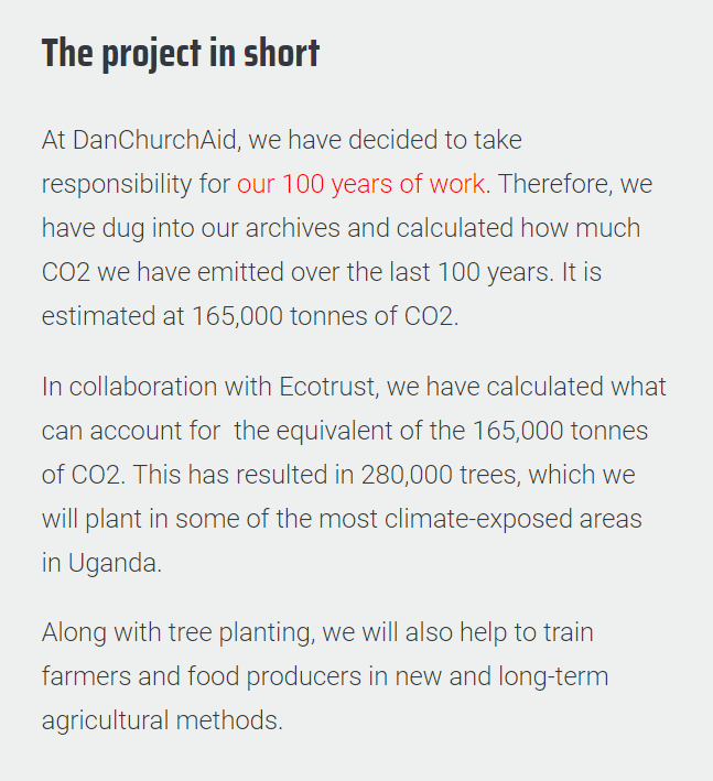 DanChurchAid has, through its 100 years as a development organization, emitted around 165.000 tons of CO2 into the atmosphere through its coordination of airlifts, clearing of landmines, supporting of partners and their efforts to build resilience, as well as through local development, such as running secondhand shops etc.