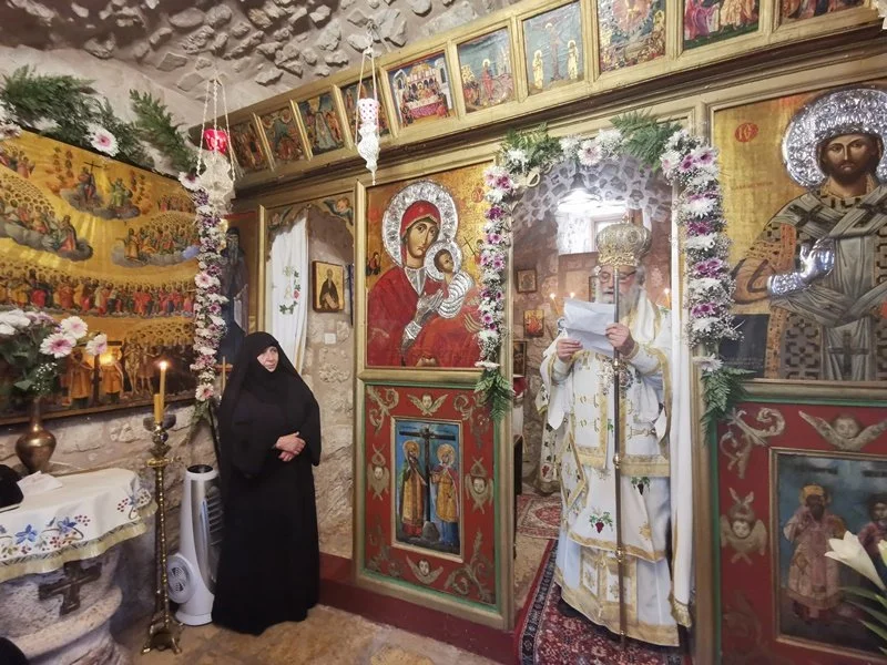 Great Vespers on Saturday afternoon and the Divine Liturgy on Sunday morning were officiated by His Eminence Metropolitan Isychios of Kapitolias, with the co-celebration of the Archimandrites Klaudios and Ieronymos, Priest Nectarios and Hierodeacon Eulogios. The chanting was delivered by the Typikon keeper of the Monastic Church of Saints Constantine and Helen Archimandrite Alexios, and Hierodeacon Dositheos in Greek and by Mr Rimon Kamar in Arabic. The services were attended by a noble congregation of nuns and laity from Greece, Russia and Romania, and the Consul General of Greece in Jerusalem Mr Evangelos Vlioras.