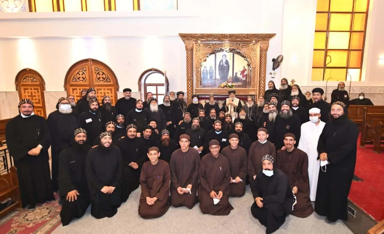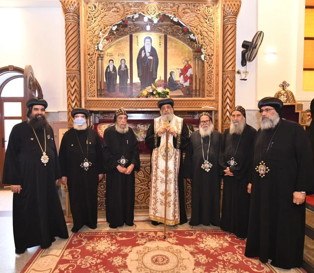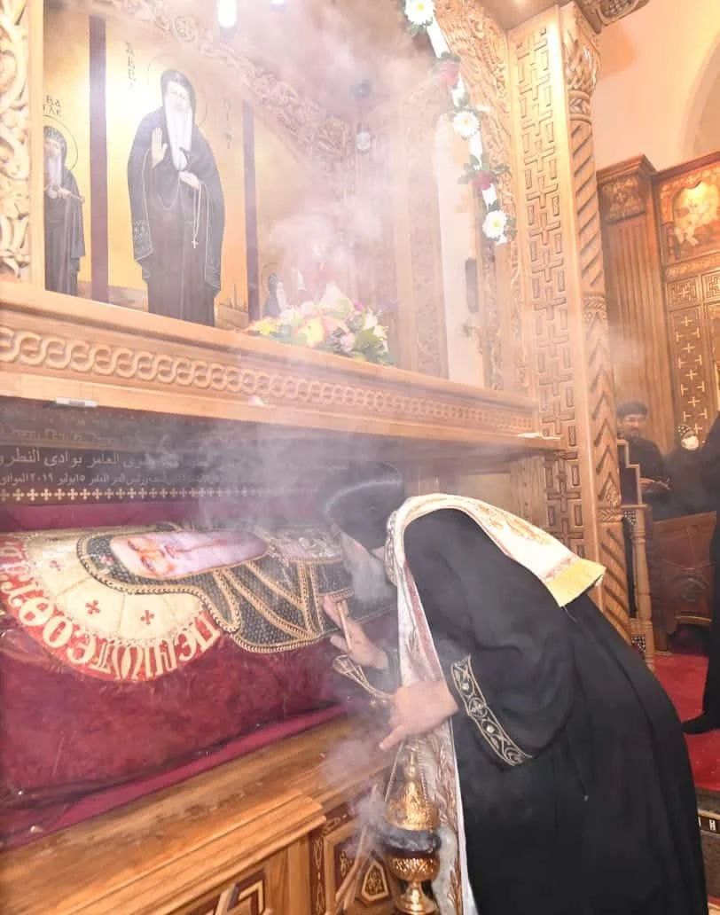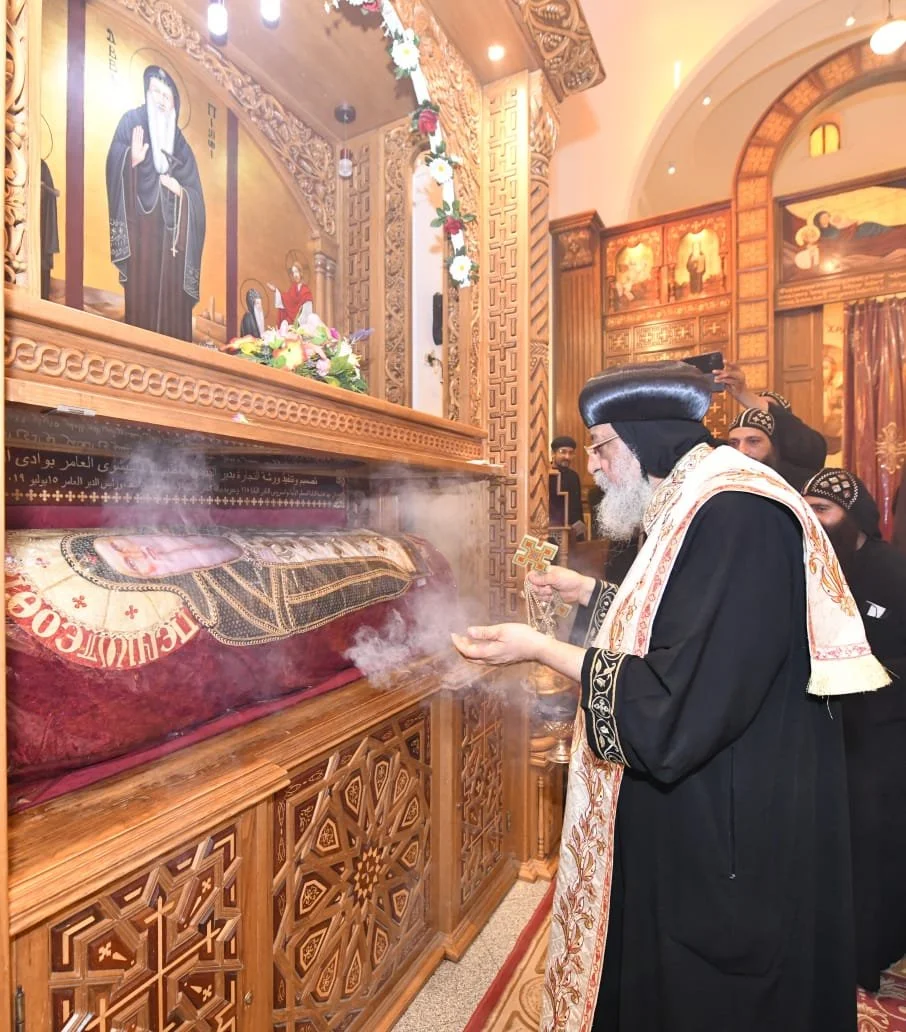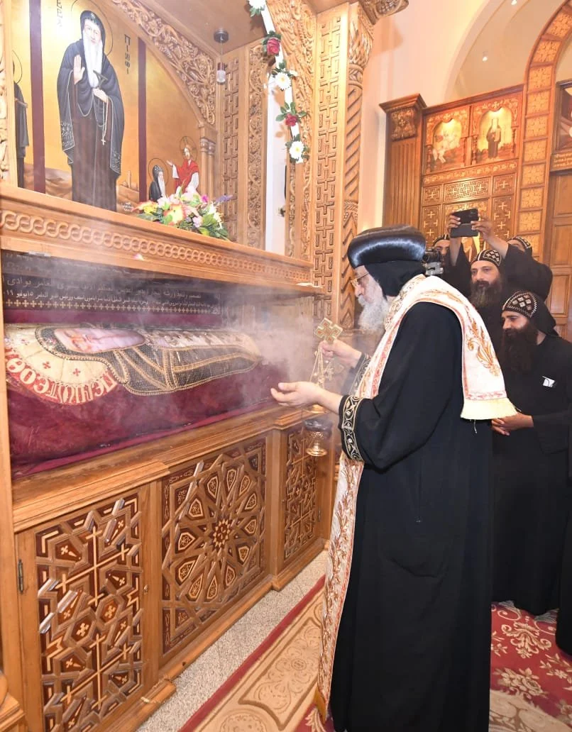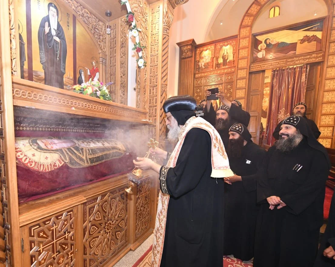 Today, His Holiness Pope Tawadros II, Pope of Alexandria and Patriarch of the See of St. Mark, celebrated Vespers for the Feast of the Departure of St. Bishoy at his monastery in Wadi El-Natrun, with the participation of six bishops and abbots of monasteries and several monks, and during which His Holiness beautified the relics of the Saint located in his feretory within the ancient monastery’s church.