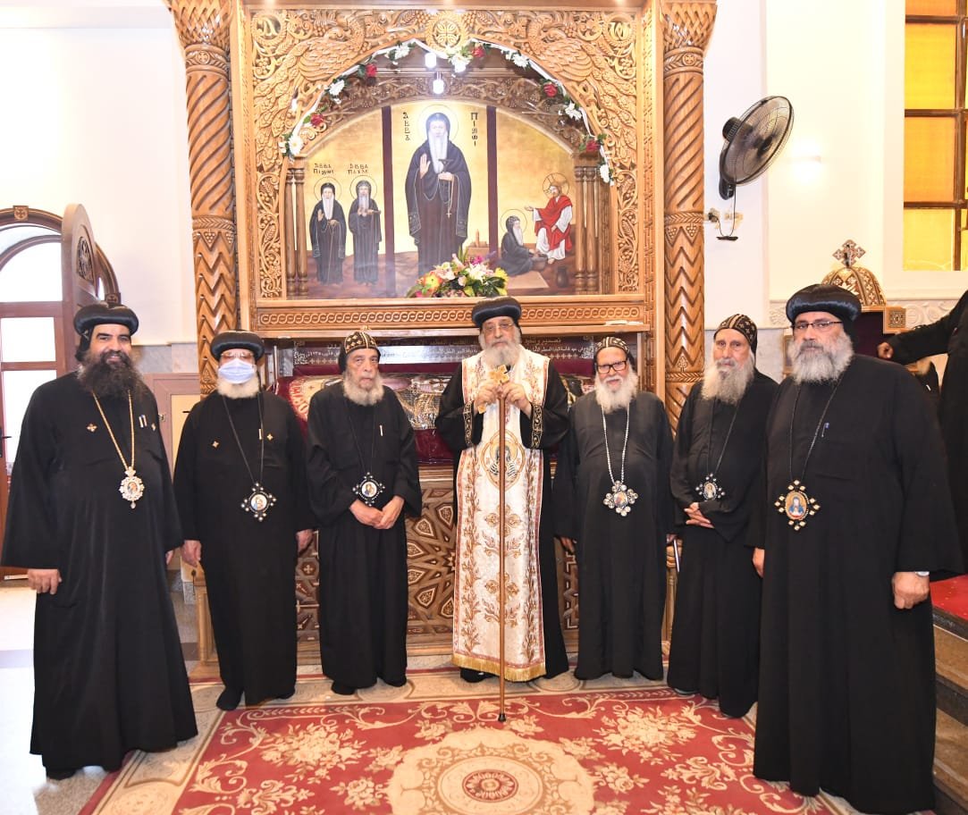His Holiness participated in the prayers along with His Grace Bishop Aghabious the bishop and abbot of the monastery, His Grace Bishop Mataeos, Bishop & Abbot of St. Mary Syrian Monastery, His Grace Bishop Esizarous, Bishop & Abbot of St. Mary Baramous Monastery, His Grace Bishop Mina, Bishop & Abbot of St. George Monastery, Khatatbah, His Grace Bishop Discoros, Bishop & Abbot of St. John the Short’s Monastery, El Alamein Road, and His Grace Bishop Bisenti, Bishop of Abnoub, Fattah & New Assiut and Abbot of St. Mina Monastery, Abnoub.