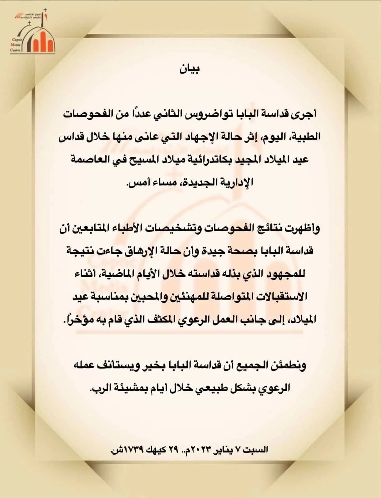 The results of the tests and diagnosis of the doctors following up with His Holiness Pope Tawadros II showed that H.H. is in good health and the state of exertion H.H. experienced by His Holiness was a result of the efforts he made during the past days, through the continuous receptions of guests to congratulate H.H. on Christmas along with the pastoral work that he carried out recently.