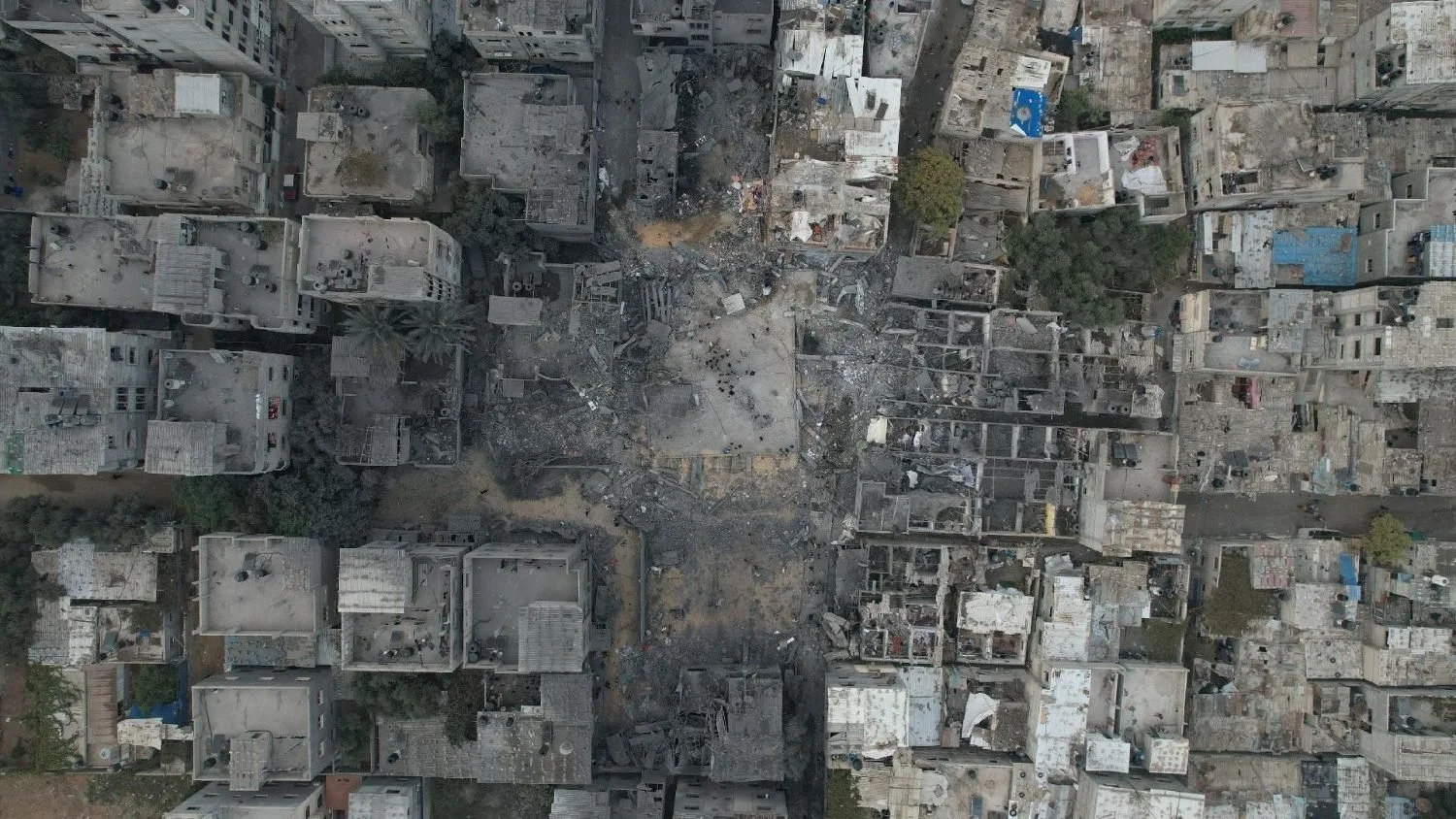 A view of the remains of a mosque and houses destroyed by [Israeli] strikes in the central Gaza Strip
