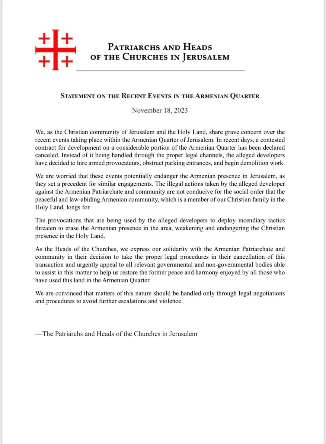 Their Beatitudes the Patriarchs and Heads of the Churches in Jerusalem Issue a Statement on the Recent Events in the Armenian Quarter