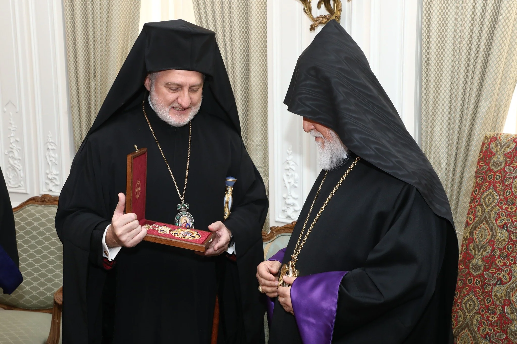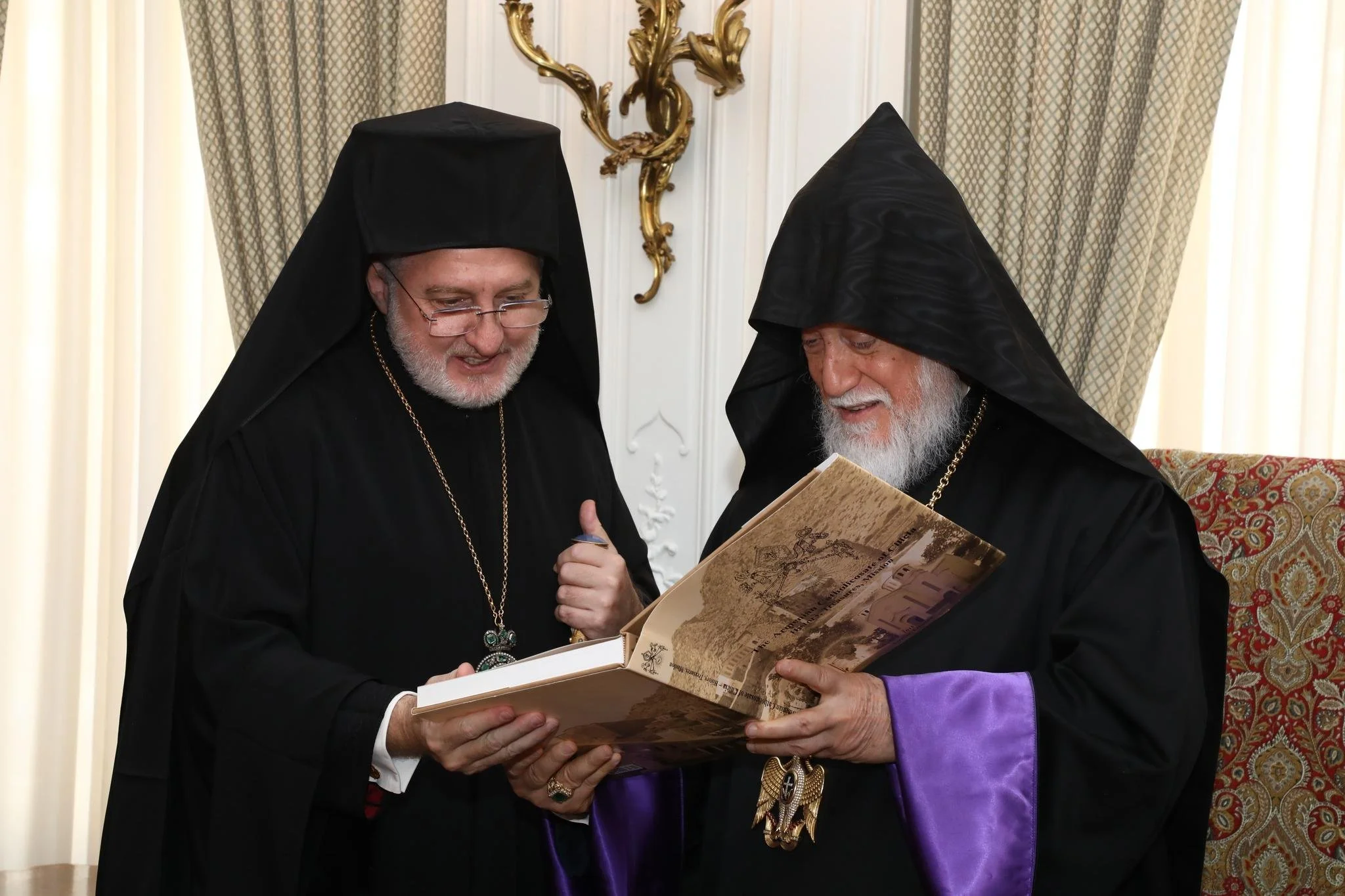 In turn, His Holiness Catholicos Aram I expressed his joy at visiting the Greek Orthodox Archdiocese for the second time, approximately 25 years later. His Holiness reflected on the historical relationship between the Armenian and Greek churches and emphasized two crucial aspects: the historical ecumenical relations between the two churches and the theological dialogue among the orthodox churches. These aspects, he noted, carry on the legacy of collaboration from the past. Concluding his speech, His Holiness presented the archbishop with the official catalog of the Catholicosate of Cilicia.